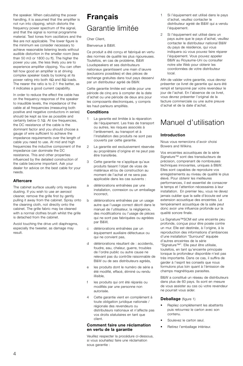 Introduction Nous vous remercions d’avoir choisi Bowers and Wilkins. Vos enceintes acoustiques de la série Signature™ sont des transducteurs de précision, comprenant de nombreuses techniques innovantes, uniques à B&W. Elles sont capables de reproduire vos enregistrements au niveau de qualité le plus élevé. Pour obtenir les meilleures performances, il est essentiel de consacrer le temps et l’attention nécessaires à leur installation. En premier lieu, vous ne devez jamais oublier que la salle d’écoute est une extension acoustique des enceintes. Le tempérament acoustique de la salle peut donc avoir une influence profonde sur la qualité sonore finale. La Signature™SCM est une enceinte peu profonde, conçue pour être posée contre un mur. Elle est destinée, à l’origine, à la reproduction des informations d’ambiances d’une installation “Surround” équipée d’autres enceintes de la série “Signature™”. Elle peut être utilisée, toutefois, en tant qu’enceinte principale lorsque la profondeur disponible n’est pas très importante. Dans ce cas, il suffira de garder à l’esprit les conseils que nous formulons plus loin quant à l’émission de champs magnétiques parasites. B&W a constitué un réseau de distributeurs dans plus de 60 pays. Ils sont en mesure de vous assister au cas où votre revendeur ne pourrait vous aider.