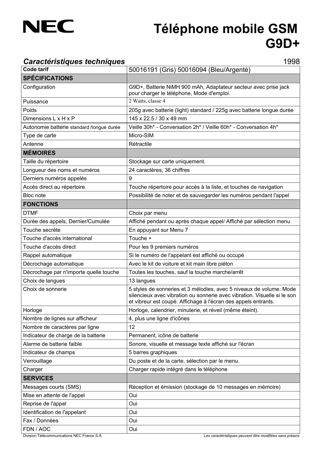 Indicateur de charge de la batterie Permanent, icône de batterie Alarme de batterie faible Sonore, visuelle et message texte affiché sur l'écran Indicateur de champs 5 barres graphiques Verrouillage Du poste et de la carte, sélection par le menu. Charger Charger rapide intégré dans le téléphone SERVICES Messages courts (SMS) Réception et émission (stockage de 10 messages en mémoire) Mise en attente de l'appel Oui Reprise de l'appel Oui Identification de l'appelant Oui Fax / Données Oui FDN / AOC Oui Division Télécommunications NEC France S.A. Les caractéristiques peuvent être modifiées sans préavis Téléphone mobile GSM G9D+