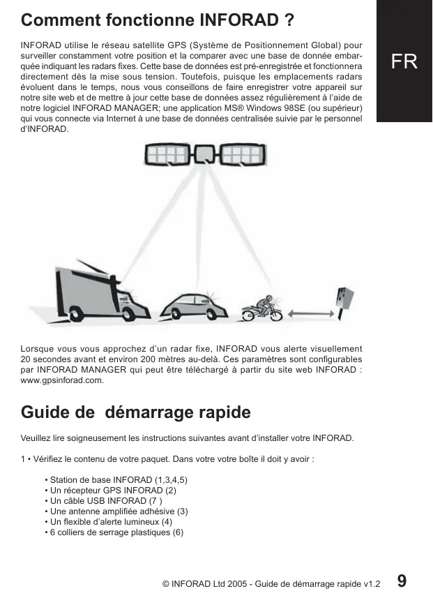 Lorsque vous vous approchez d’un radar fixe, INFORAD vous alerte visuellement 20 secondes avant et environ 200 mètres au-delà. Ces paramètres sont configurables par INFORAD MANAGER qui peut être téléchargé à partir du site web INFORAD : www.gpsinforad.com. Guide de démarrage rapide Veuillez lire soigneusement les instructions suivantes avant d’installer votre INFORAD. 1 • Vérifiez le contenu de votre paquet. Dans votre votre boîte il doit y avoir :