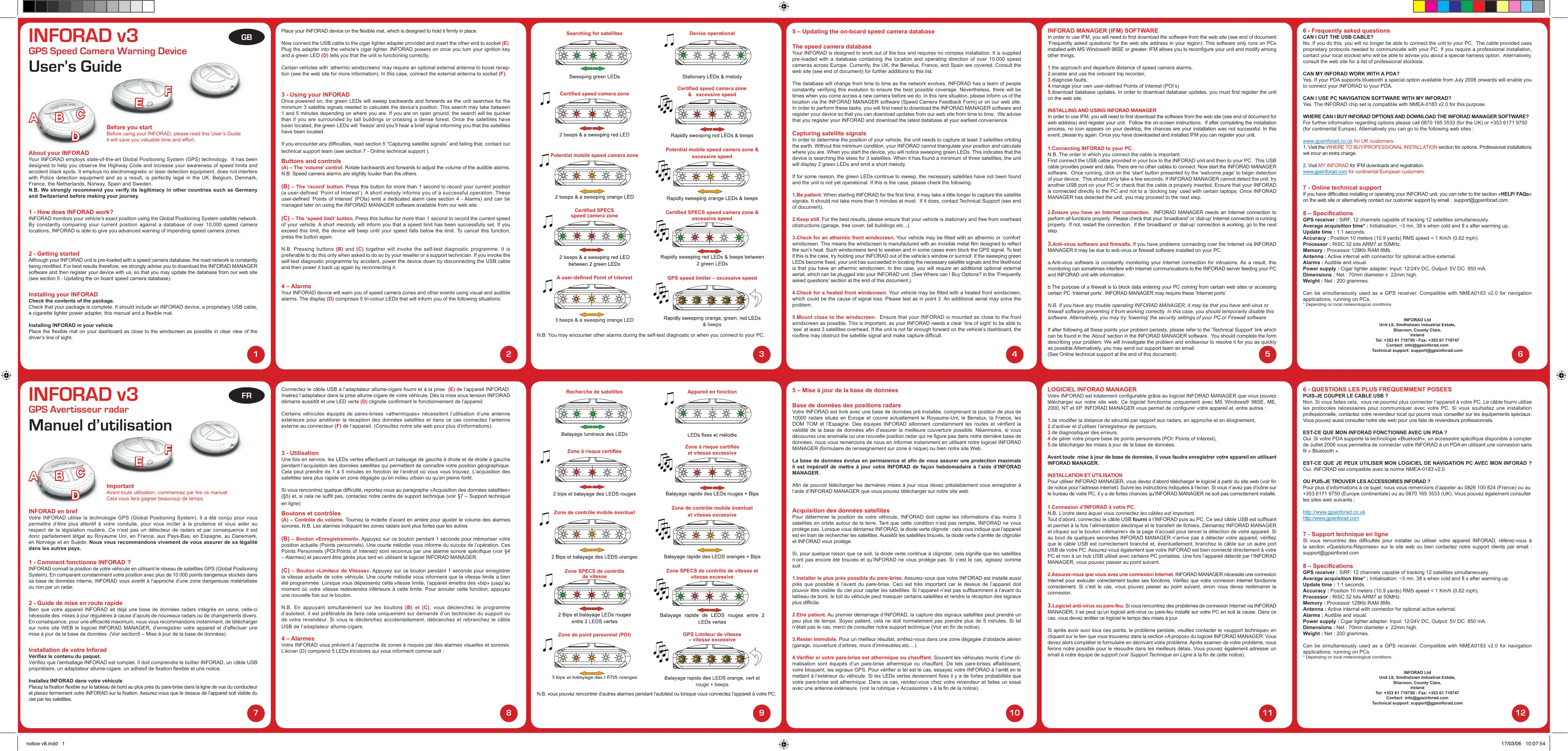 INFORAD v3 4.Check for a heated front windscreen. Your vehicle may be fitted with a heated front windscreen, which could be the cause of signal loss. Please test as in point 3. An additional aerial may solve the problem. Your INFORAD device will warn you of speed camera zones and other events using visual and audible alarms. The display (D) comprises 5 tri-colour LEDs that will inform you of the following situations: Installing INFORAD in your vehicle Place the flexible mat on your dashboard as close to the windscreen as possible in clear view of the driver’s line of sight. 3.Check for an athermic front windscreen. Your vehicle may be fitted with an athermic or ‘comfort’ windscreen. This means the windscreen is manufactured with an invisible metal film designed to reflect the sun’s heat. Such windscreens tend to weaken and in some cases even block the GPS signal. To test if this is the case, try holding your INFORAD out of the vehicle’s window or sunroof. If the sweeping green LEDs become fixed, your unit has succeeded in locating the necessary satellite signals and the likelihood is that you have an athermic windscreen. In this case, you will require an additional optional external aerial, which can be plugged into your INFORAD unit. (See Where can I Buy Options? in the ‘Frequently asked questions’ section at the end of this document.) Si, pour quelque raison que ce soit, la diode verte continue à clignoter, cela signifie que les satellites n’ont pas encore été trouvés et qu’INFORAD ne vous protège pas. Si c’est le cas, agissez comme suit : 1.Installer le plus près possible du pare-brise. Assurez-vous que votre INFORAD est installé aussi près que possible à l’avant du pare-brise. Ceci est très important car le dessus de l’appareil doit pouvoir être visible du ciel pour capter les satellites. Si l’appareil n’est pas suffisamment à l’avant du tableau de bord, le toit du véhicule peut masquer certains satellites et rendre la réception des signaux plus difficile. 2.Etre patient. Au premier démarrage d’INFORAD, la capture des signaux satellites peut prendre un peu plus de temps. Soyez patient, cela ne doit normalement pas prendre plus de 5 minutes. Si tel n’était pas le cas, merci de consulter notre support technique (Voir en fin de notice). 3.Rester immobile. Pour un meilleur résultat, arrêtez-vous dans une zone dégagée d’obstacle aérien (garage, couverture d’arbres, murs d’immeubles etc....). Balayage rapide des LEDS orange, vert et rouge + beeps 4.Vérifier si votre pare-brise est athermique ou chauffant. Souvent les véhicules munis d’une climatisation sont équipés d’un pare-brise athermique ou chauffant. De tels pare-brises affaiblissent, voire bloquent, les signaux GPS. Pour vérifier si tel est le cas, essayez votre INFORAD à l’arrêt en le mettant à l’extérieur du véhicule. Si les LEDs vertes deviennent fixes il y a de fortes probabilités que votre pare-brise soit athermique. Dans ce cas, rendez-vous chez votre revendeur et faites un essai avec une antenne extérieure. (voir la rubrique « Accessoires » à la fin de la notice).