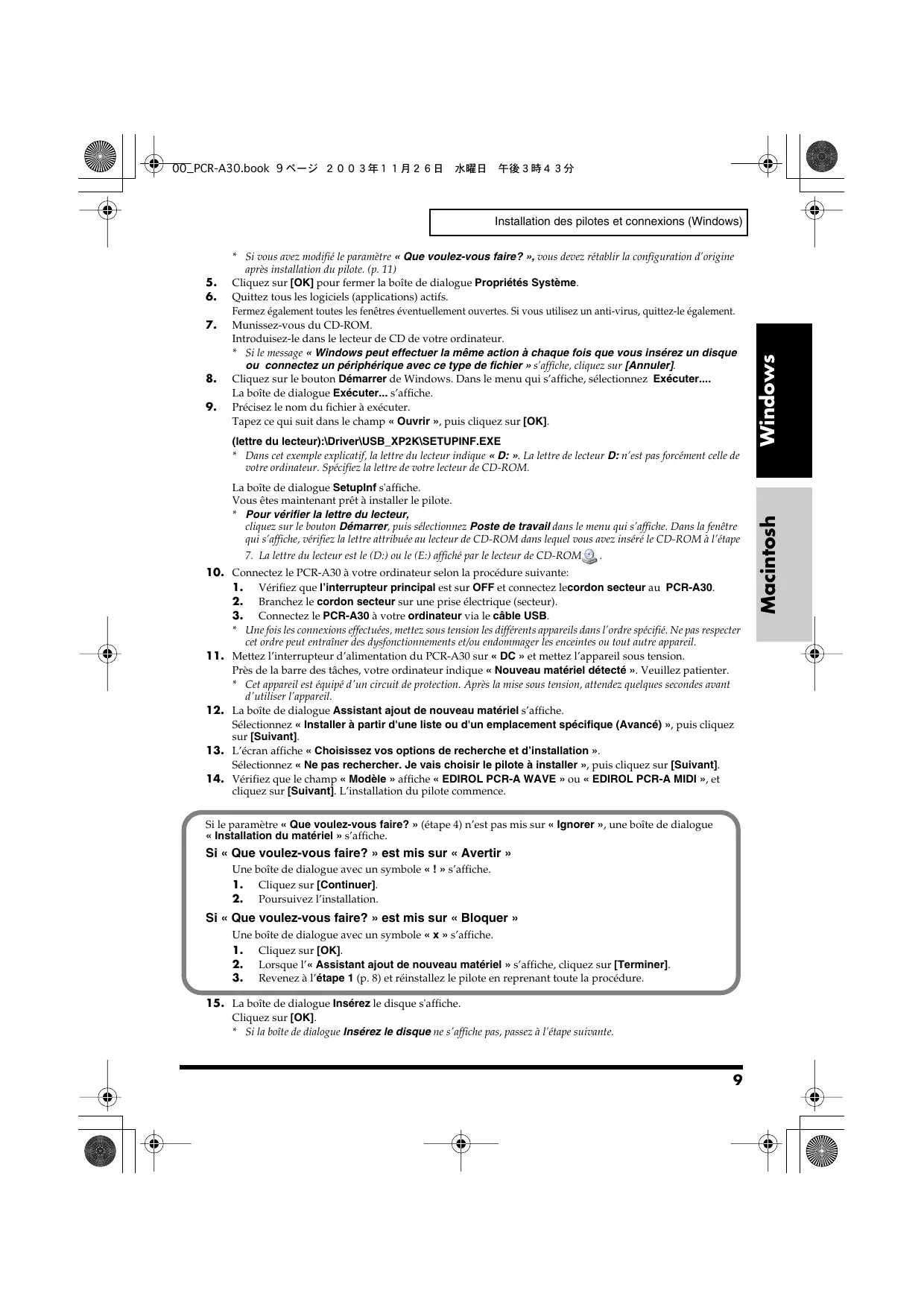 - ASIO (Interface d’entrée/sortie Audio Steinberg). Standard d'interface audio développé par Steinberg Corporation. Lorsque le PCR-A30 est utilisé avec un logiciel compatible ASIO, la synchronisation est plus précise, ce qui procure un excellent environnement de production musicale. Le PCR-A30 ne peut lire des données audio du gestionnaire de sons Macintosh (par ex. CD audio et alarmes sonores). Windows Installation du pilote ASIO Le pilote ASIO du PCR-A30 supporte les canaux d’entrée/sortie audio suivants. Entrée audio................................24/16 bits Sortie audio .................................24/16 bits 1 canal stéréo (2 canaux monophoniques) 1 canal stéréo (2 canaux monophoniques) Macintosh