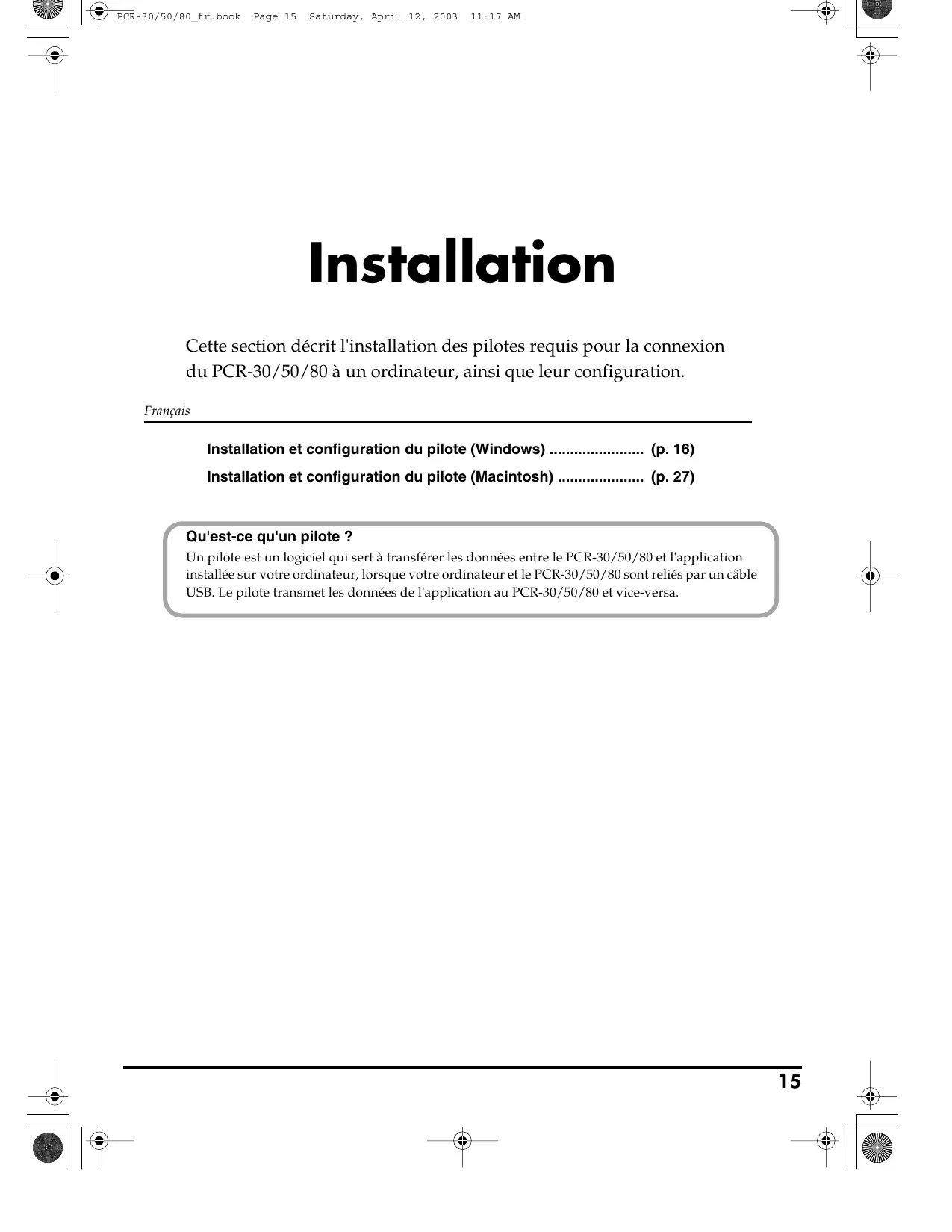 PCR-30/50/80_fr.book Page 15 Saturday, April 12, 2003 11:17 AM Installation Cette section décrit l'installation des pilotes requis pour la connexion du PCR-30/50/80 à un ordinateur, ainsi que leur configuration. Français Installation et configuration du pilote (Windows) ....................... (p. 16) Installation et configuration du pilote (Macintosh) ..................... (p. 27) Qu'est-ce qu'un pilote ? Un pilote est un logiciel qui sert à transférer les données entre le PCR-30/50/80 et l'application installée sur votre ordinateur, lorsque votre ordinateur et le PCR-30/50/80 sont reliés par un câble USB. Le pilote transmet les données de l'application au PCR-30/50/80 et vice-versa.