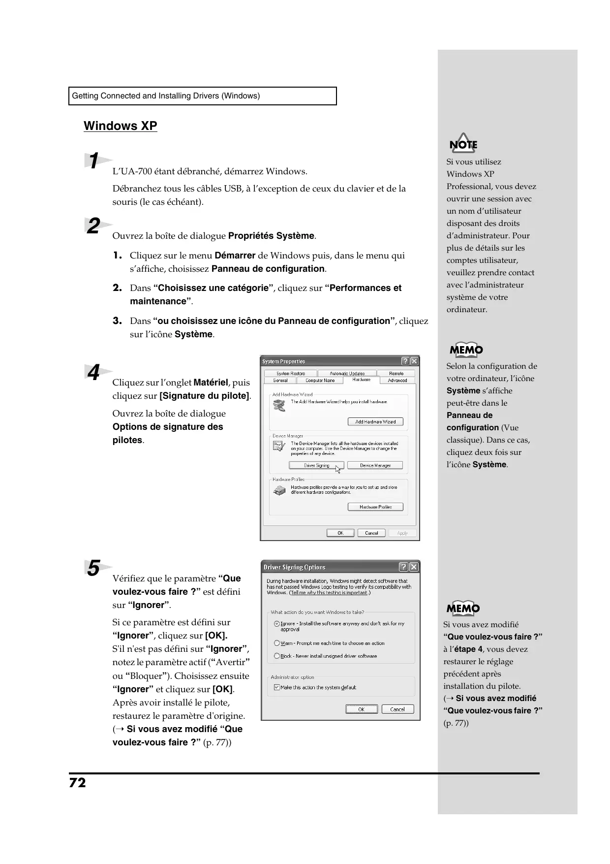 Cliquez sur l’onglet Matériel, puis cliquez sur [Signature du pilote]. Ouvrez la boîte de dialogue Options de signature des pilotes. Selon la configuration de votre ordinateur, l’icône Système s’affiche peut-être dans le Panneau de configuration (Vue classique). Dans ce cas, cliquez deux fois sur l’icône Système. fig.2-2