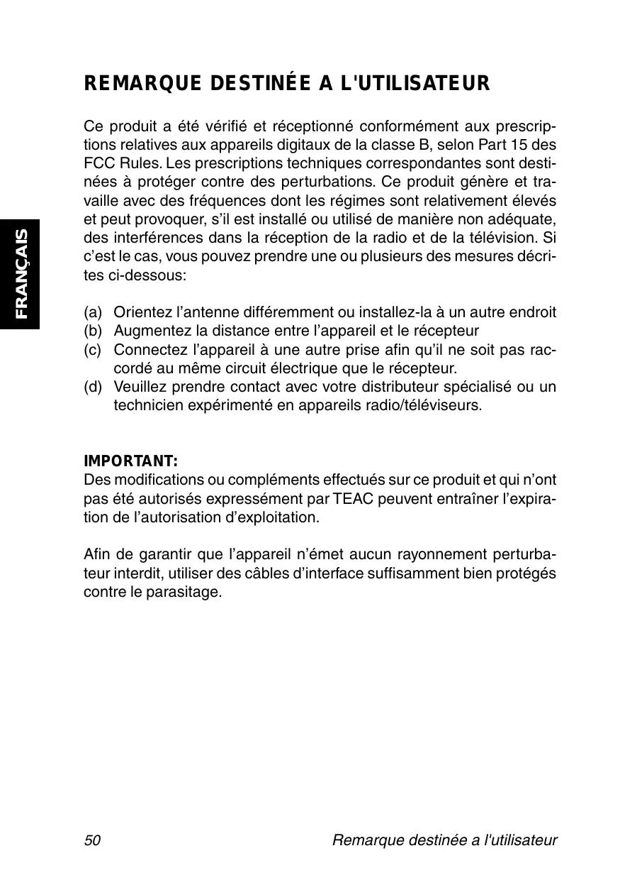 Ce produit a été vérifié et réceptionné conformément aux prescriptions relatives aux appareils digitaux de la classe B, selon Part 15 des FCC Rules. Les prescriptions techniques correspondantes sont destinées à protéger contre des perturbations. Ce produit génère et travaille avec des fréquences dont les régimes sont relativement élevés et peut provoquer, s’il est installé ou utilisé de manière non adéquate, des interférences dans la réception de la radio et de la télévision. Si c’est le cas, vous pouvez prendre une ou plusieurs des mesures décrites ci-dessous: (a) Orientez l’antenne différemment ou installez-la à un autre endroit (b) Augmentez la distance entre l’appareil et le récepteur (c) Connectez l’appareil à une autre prise afin qu’il ne soit pas raccordé au même circuit électrique que le récepteur. (d) Veuillez prendre contact avec votre distributeur spécialisé ou un technicien expérimenté en appareils radio/téléviseurs. IMPORTANT: Des modifications ou compléments effectués sur ce produit et qui n’ont pas été autorisés expressément par TEAC peuvent entraîner l’expiration de l’autorisation d’exploitation. Afin de garantir que l’appareil n’émet aucun rayonnement perturbateur interdit, utiliser des câbles d’interface suffisamment bien protégés contre le parasitage.