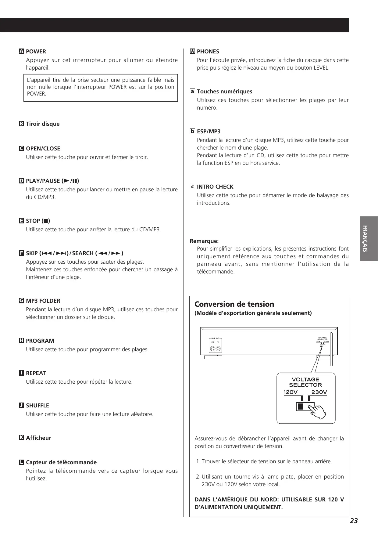 Pendant la lecture d’un disque MP3, utilisez ces touches pour sélectionner un dossier sur le disque. Remarque: Pour simplifier les explications, les présentes instructions font uniquement référence aux touches et commandes du panneau avant, sans mentionner l’utilisation de la télécommande. Conversion de tension (Modèle d’exportation générale seulement) H PROGRAM Utilisez cette touche pour programmer des plages. I REPEAT Utilisez cette touche pour répéter la lecture. J SHUFFLE Utilisez cette touche pour faire une lecture aléatoire. K Afficheur Assurez-vous de débrancher l’appareil avant de changer la position du convertisseur de tension. L Capteur de télécommande