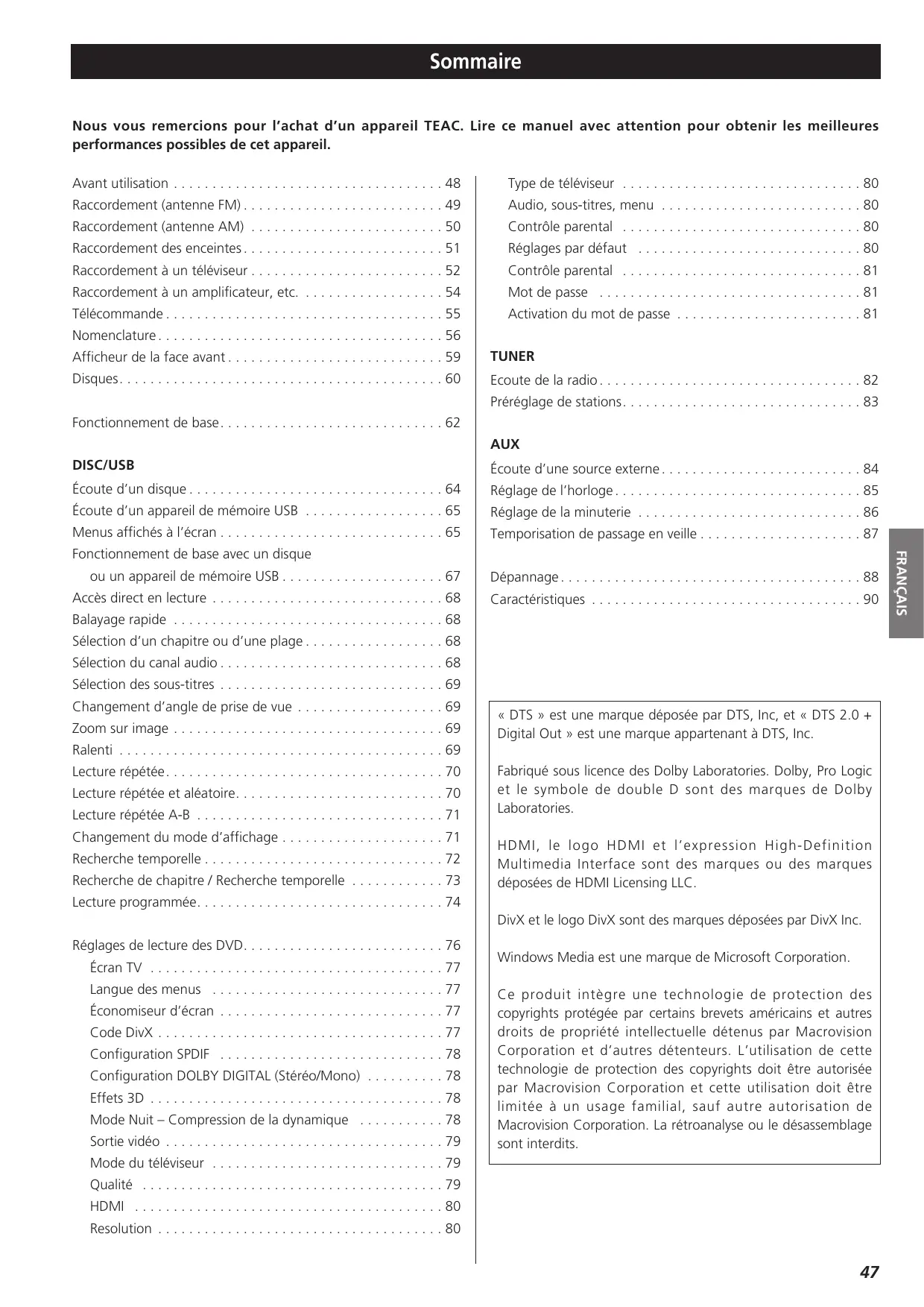 Nous vous remercions pour l’achat d’un appareil TEAC. Lire ce manuel avec attention pour obtenir les meilleures performances possibles de cet appareil. Avant utilisation . . . . . . . . . . . . . . . . . . . . . . . . . . . . . . . . . . . 48