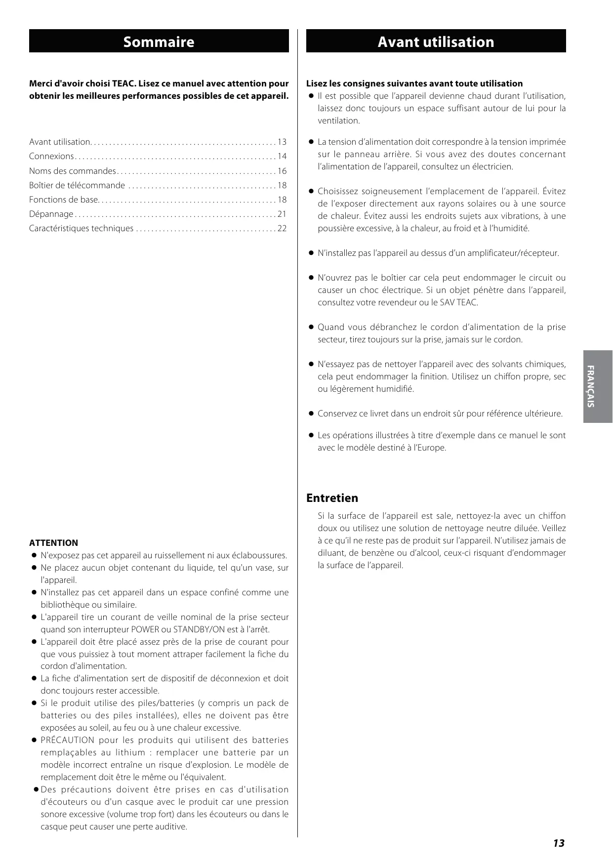 Merci d'avoir choisi TEAC. Lisez ce manuel avec attention pour obtenir les meilleures performances possibles de cet appareil.