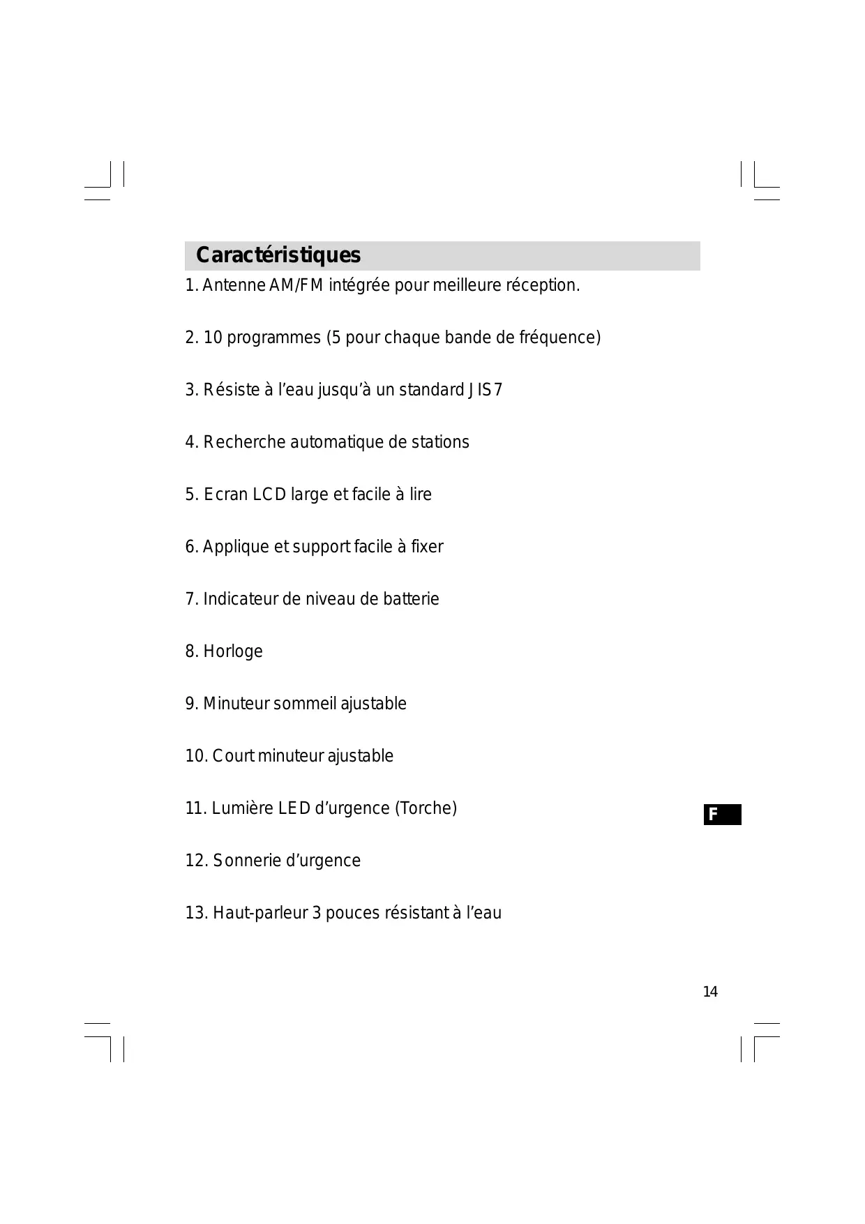 Durée de vie d’une pile: Approx. 120 heures d’écoute pendant 4heures par jour à volume normal en utilisant des piles alcalines. Fréquences couvertes: FM 87.50 – 108 MHz AM (MW) 522 – 1629 kHz or 520 – 1710 kHz Caractéristiques circuit Haut-parleur: 3 pouces, 8 ohm étendue complète, résistant à l’eau. Sortie électrique: 500 mW Système d’antenne: Antenne fil FM Tige en ferrite AM ( MW )