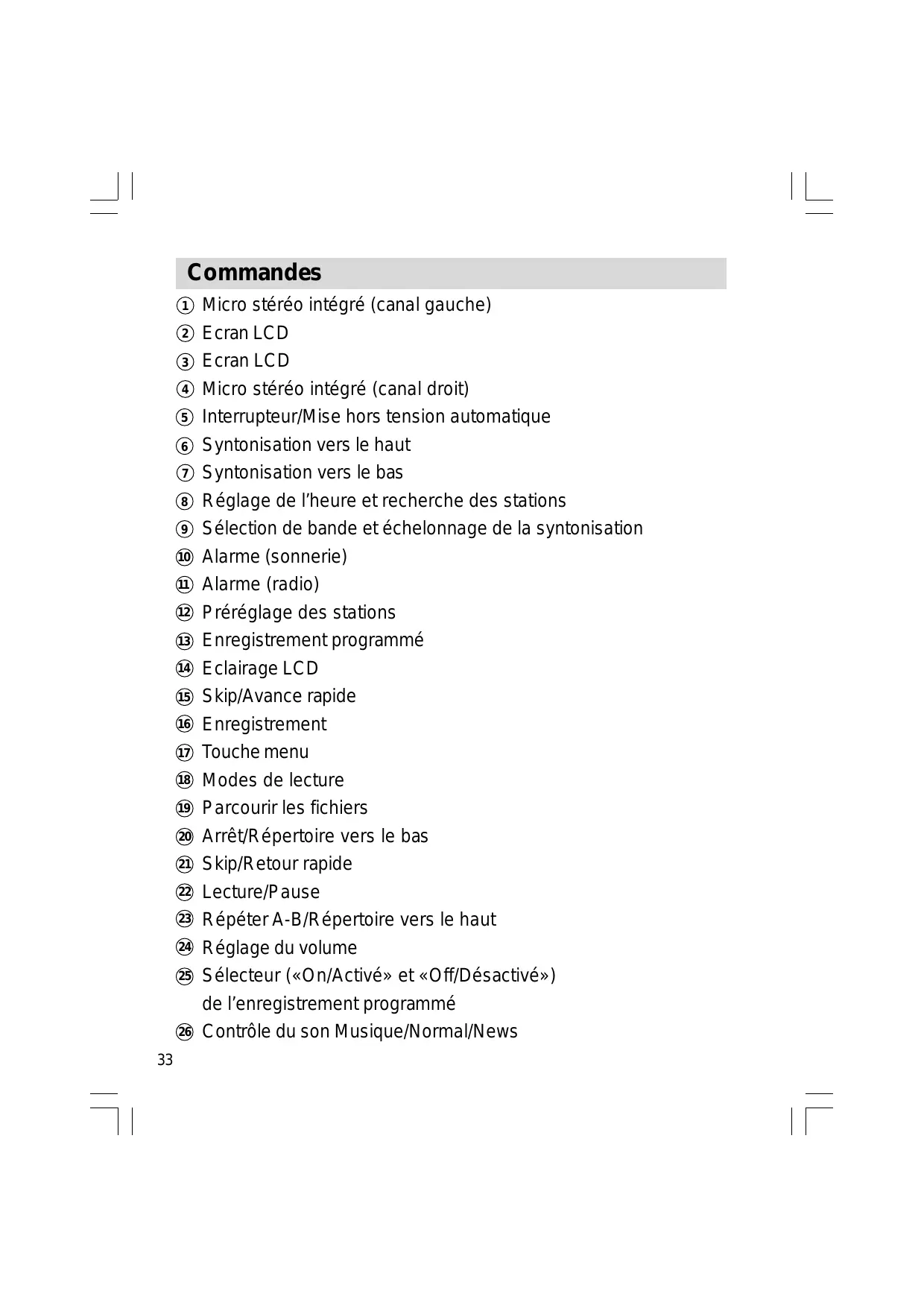 Micro stéréo intégré (canal gauche) Ecran LCD Ecran LCD Micro stéréo intégré (canal droit) Interrupteur/Mise hors tension automatique Syntonisation vers le haut Syntonisation vers le bas Réglage de l’heure et recherche des stations Sélection de bande et échelonnage de la syntonisation Alarme (sonnerie) Alarme (radio) Préréglage des stations Enregistrement programmé Eclairage LCD Skip/Avance rapide Enregistrement Touche menu Modes de lecture Parcourir les fichiers Arrêt/Répertoire vers le bas Skip/Retour rapide Lecture/Pause Répéter A-B/Répertoire vers le haut Réglage du volume Sélecteur («On/Activé» et «Off/Désactivé») de l’enregistrement programmé Contrôle du son Musique/Normal/News