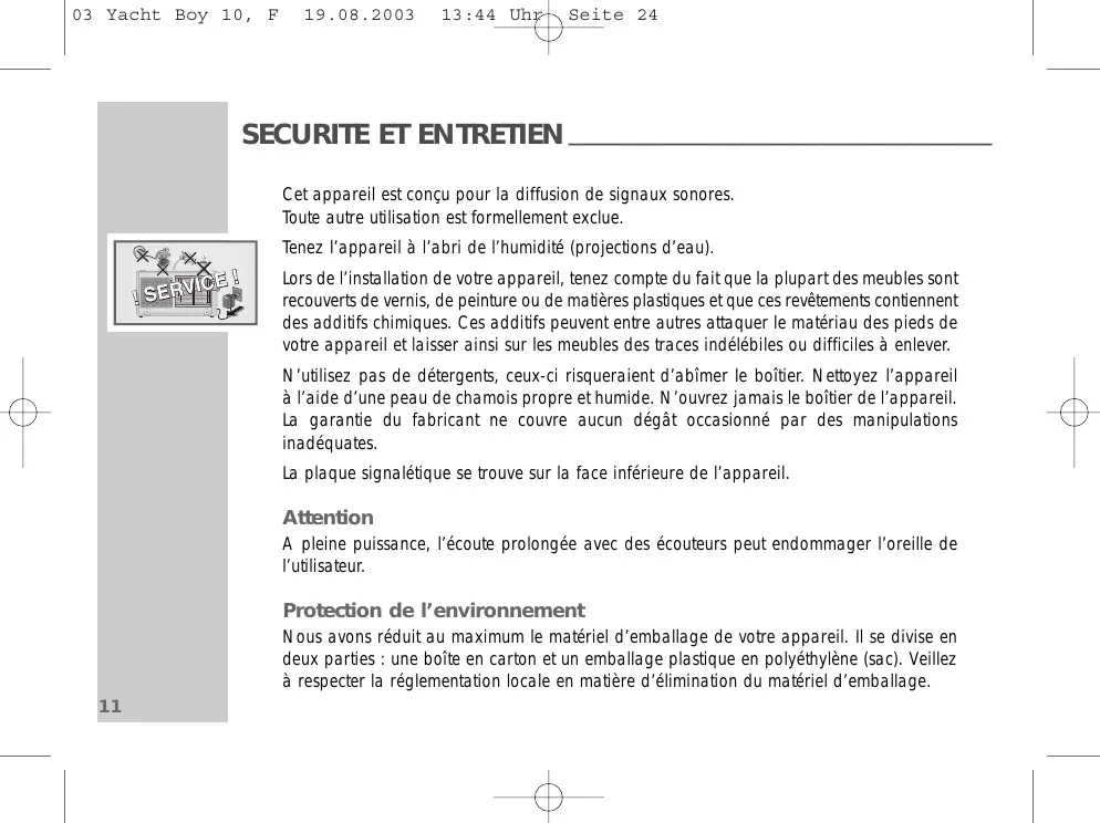Cet appareil est antiparasité conformément aux directives européennes en vigueur. Ce produit est conforme aux directives européennes 89/336/CEE, 73/23/CEE et 93/68/CEE. Cet appareil correspond à la directive de sécurité DIN EN 60065 (VDE 0860) et donc à la prescription de sécurité internationale IEC 60065. Sous réserve de modifications techniques et optiques ! FRANÇAIS 03 Yacht Boy 10, F
