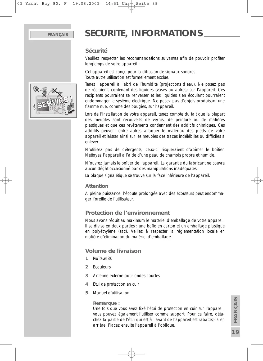 03 Yacht Boy 80, F 19.08.2003 14:51 Uhy- FRANÇAIS Seite 39 SECURITE, INFORMATIONS Sécurité Veuillez respecter les recommandations suivantes afin de pouvoir profiter longtemps de votre appareil: Cet appareil est conçu pour la diffusion de signaux sonores. Toute autre utilisation est formellement exclue. Tenez l'appareil à l'abri de l'humidité (projections d'eau). Ne posez pas de récipients contenant des liquides (vases ou autres) sur l'appareil. Ces récipients pourraient se renverser et les liquides s'en écoulant pourraient endommager le système électrique. Ne posez pas d'objets produisant une famme nue, comme des bougies, sur l'appareil. Lors de l'installation de votre appareil, tenez compte du fait que la plupart des meubles sont recouverts de vernis, de peinture ou de matières plastiques et que ces revêtements contiennent des additifs chimiques. Ces additifs peuvent entre autres attaquer le matériau des pieds de votre appareil et laisser ainsi sur les meubles des traces indélébiles ou difficiles à enlever. N'utilisez pas de détergents, ceux-ci risqueraient d'abimer le boitier. Netoyez l'appareil à l'aide d'une peau de chamois propre et humide. N'ouvrez jamais le boîtier de l'appareil. La garantie du fabricant ne couvre aucun dégât occasionné par des manipulations inadéquates. La plaque signalétique se trouve sur la face inférieure de l'appareil Attention À pleine puissance, l'écoute prolongée avec des écouteurs peut endomma- ger l'oreille de l'utilisateur. Protection de l’environnement Nous avons réduit au maximum le matériel d'emballage de votre appareil. Il se divise en deux parties : une boîte en carton et un emballage plastique en polyéthylène (sac). Veillez à respecter la réglementation locale en matière d'élimination du matériel d'emballage. Volume de livraison 1 Pole 80 2 Ecouteurs 3 Antenne externe pour ondes courtes 4 Etui de protection en cuir