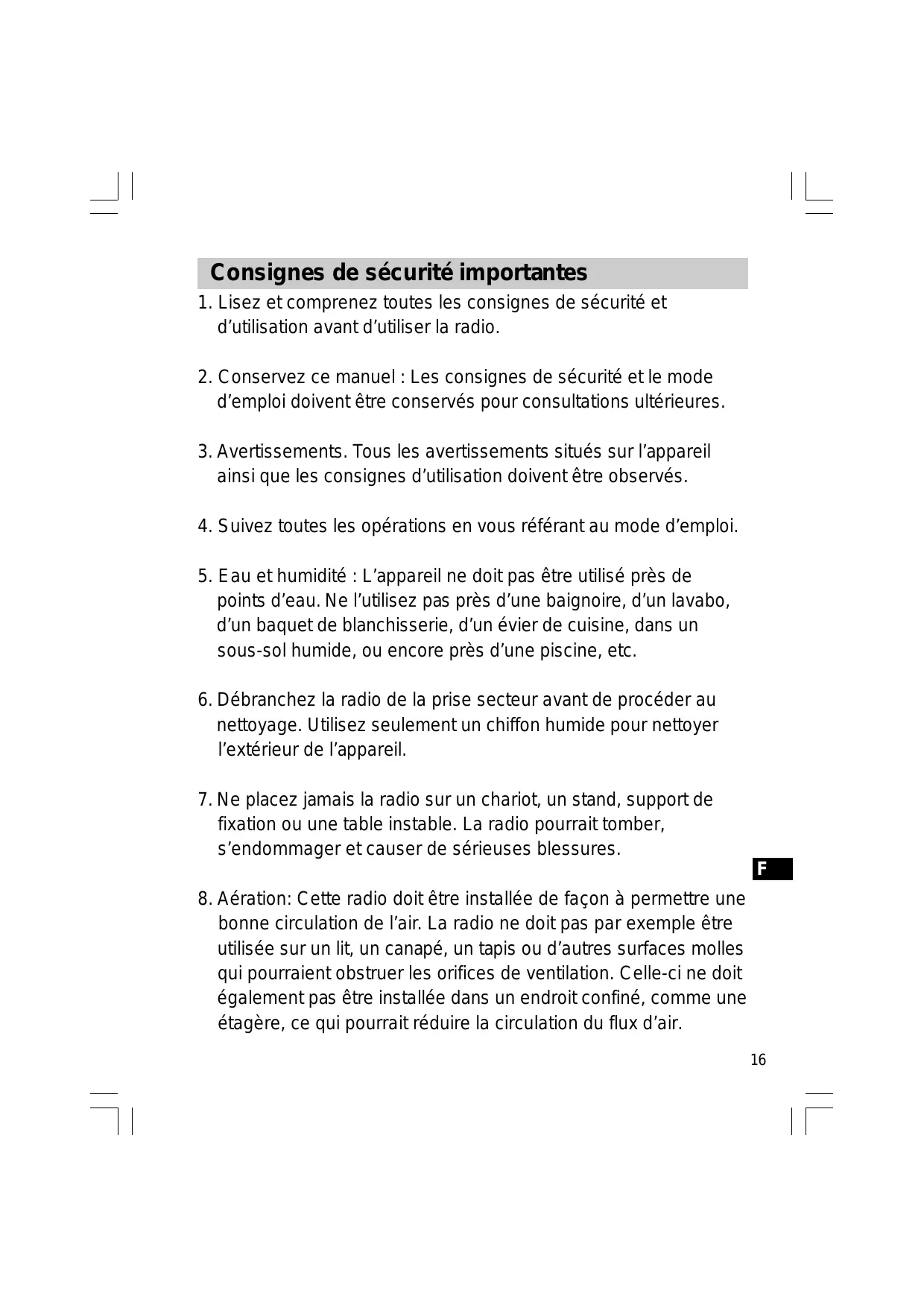 8. Aération: Cette radio doit être installée de façon à permettre une