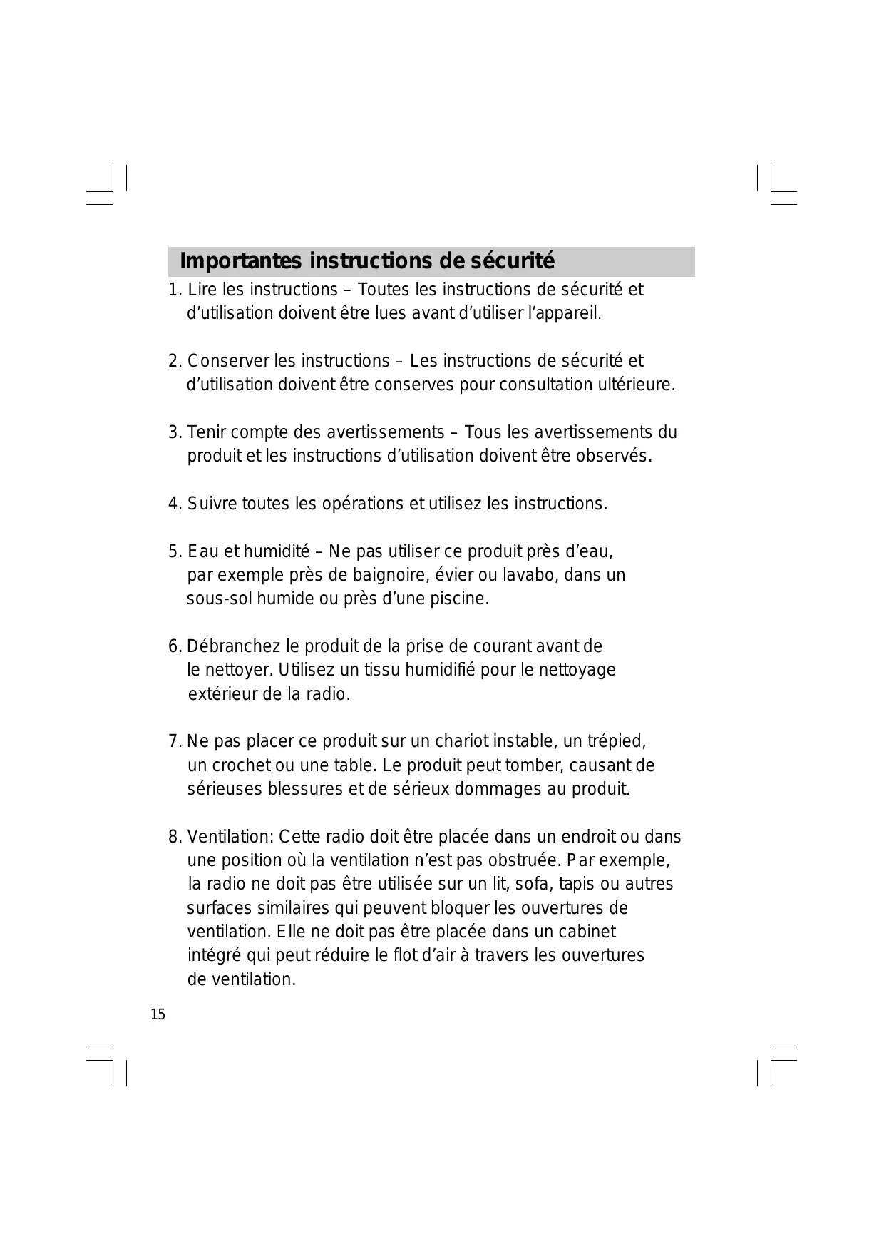 8. Ventilation: Cette radio doit être placée dans un endroit ou dans