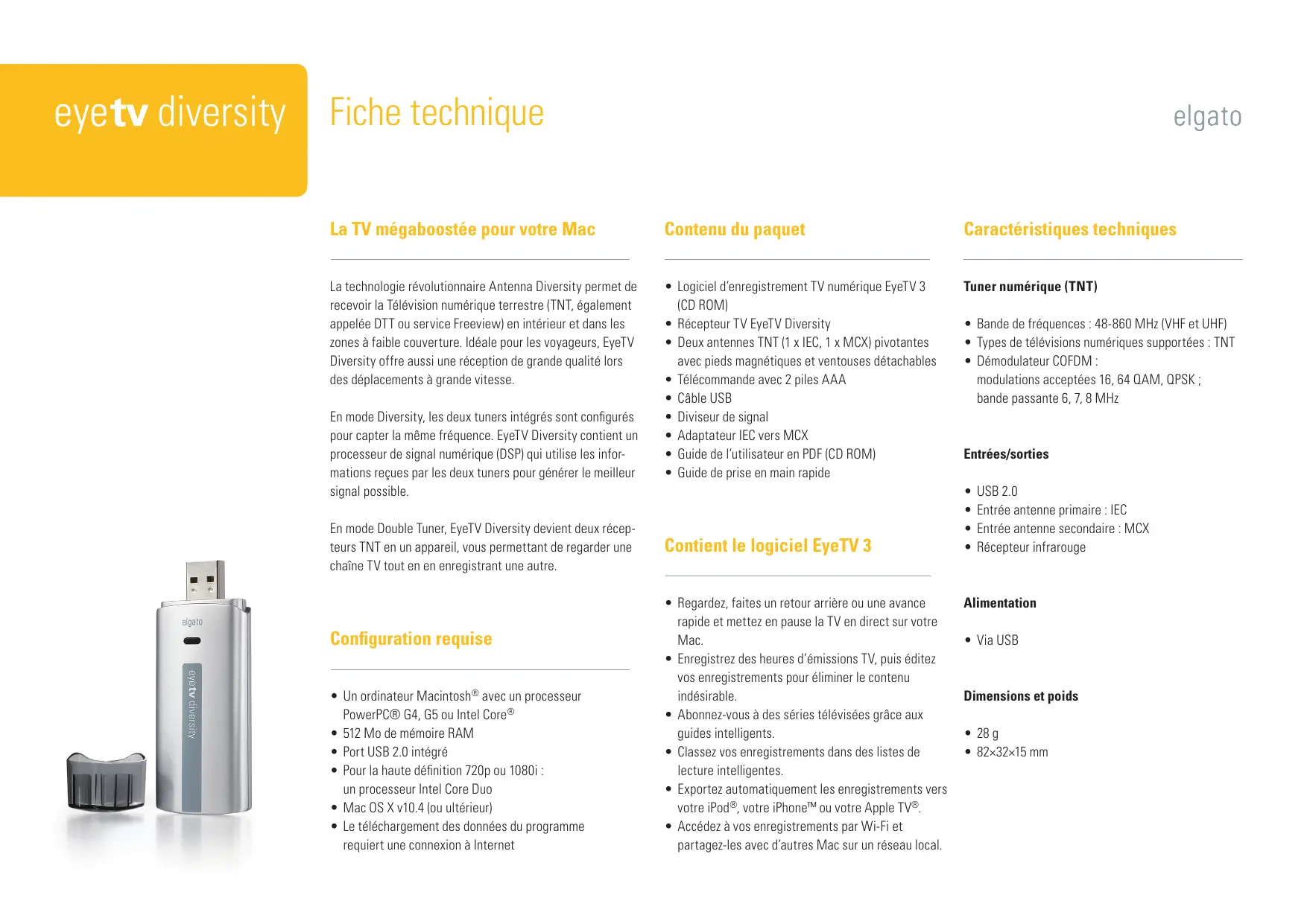 eyetv diversity eigatol Fiche technique La TV mégaboostée pour votre Mac Contenu du paquet elgato Caractéristiques techniques La technologie révolutionnaire Antenna Diversity permet de recevoir la Télévision numérique terrestre (TNT, également appelée DTT ou service Freeview] en intérieur et dans les zones à faible couverture. Idéale pour les voyageurs, EyeTV Diversity offre aussi une réception de grande qualité lors des déplacements à grande vitesse. En mode Diversity, les deux tuners intégrés sont configurés pour capter la même fréquence. EyeTV Diversity contient un processeur de signal numérique (DSP] qui utilise les infor- mations reçues par les deux tuners pour générer le meilleur signal possible. En mode Double Tuner, EyeTV Diversity devient deux récep- teurs TNT en un appareil, vous permettant de regarder une chaîne TV tout en en enregistrant une autre. Configuration requise + Un ordinateur Macintosh® avec un processeur PowerPC® G4, G5 ou Intel Core® + 512 Mo de mémoire RAM + Port USB 2.0 intégré + Pour la haute définition 720p ou 1080i : un processeur Intel Core Duo + Mac OS X v10.4 (ou ultérieur) < Le téléchargement des données du programme requiert une connexion à Internet + Logiciel d'enregistrement TV numérique EyeTV 3 (CD ROM} + Récepteur TV EyeTV Diversity + Deux antennes TNT (1 x IEC, 1 x MCX) pivotantes avec pieds magnétiques et ventouses détachables + Télécommande avec 2 piles AAA + Câble USB + Diviseur de signal + Adaptateur IEC vers MCX + Guide de l'utilisateur en PDF (CD ROM} + Guide de prise en main rapide Contient le logiciel EyeTV 3 + Regardez, faites un retour arrière ou une avance rapide et mettez en pause la TV en direct sur votre Mac. + Enregistrez des heures d'émissions TV, puis éditez vos enregistrements pour éliminer le contenu indésirable. + Abonnez-vous à des séries télévisées grâce aux guides intelligents. + Classez vos enregistrements dans des listes de lecture intelligentes. + Exportez automatiquement les enregistrements vers votre iPod®, votre iPhone" ou votre Apple TV®. + Accédez à vos enregistrements par Wi-Fi et partagez-les avec d'autres Mac sur un réseau local. Tuner numérique (TNT) + Bande de fréquences : 48-860 MHz (VHF et UHF) + Types de télévisions numériques supportées : TNT + Démodulateur COFDM : modulations acceptées 16, 64 QAM, QPSK ; bande passante 6, 7,8 MHz Entrées/sorties + USB20 + Entrée antenne primaire : IEC + Entrée antenne secondaire : MCX + Récepteur infrarouge Alimentation + Via USB Dimensions et poids °28q + 82x32x15 mm