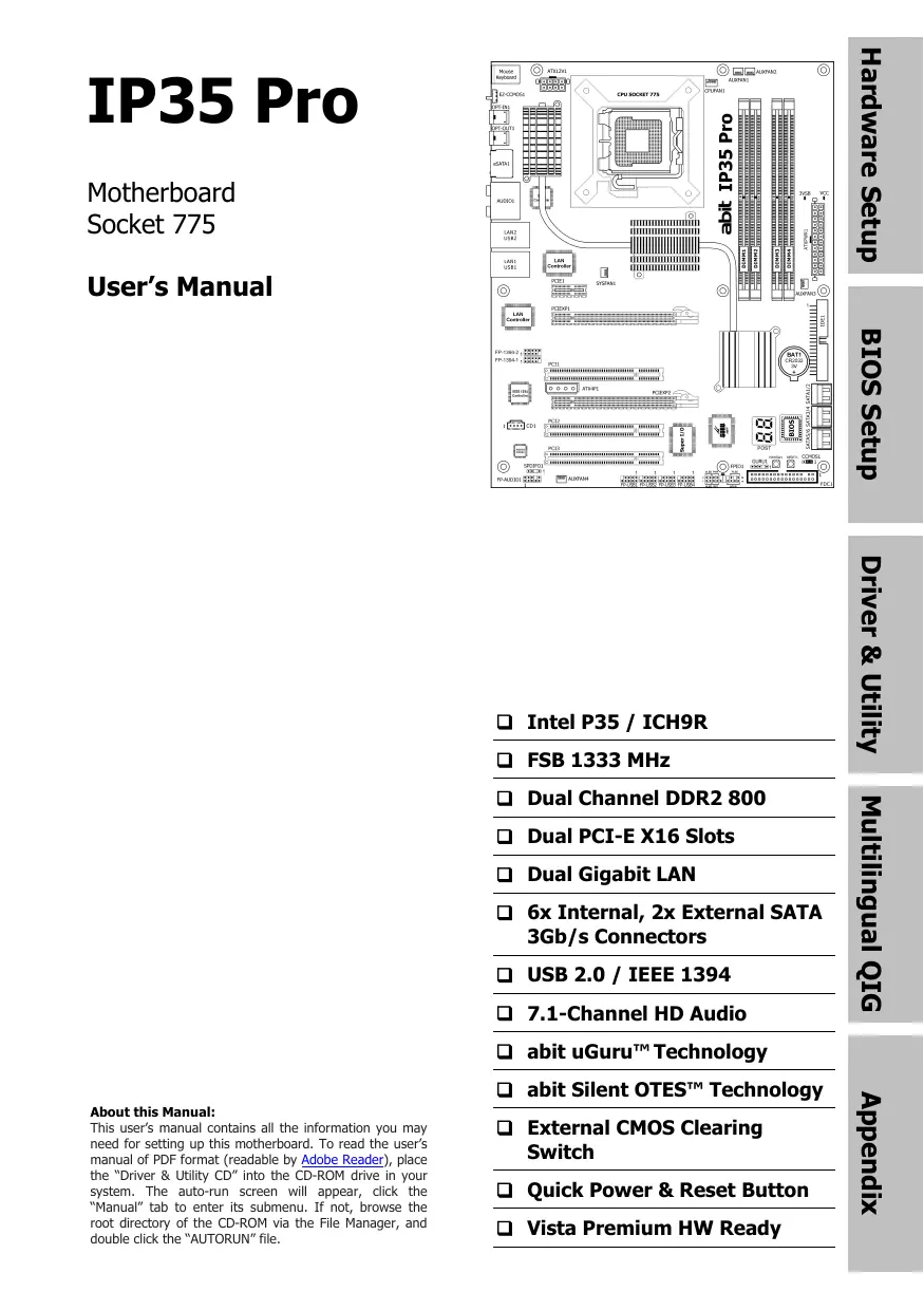 Téléchargez la notice de votre Carte mère au format PDF gratuitement ! Retrouvez votre notice IP35 PRO - ABIT et reprennez votre appareil électronique en main. Sur cette page sont publiés tous les documents nécessaires à l'utilisation de votre appareil IP35 PRO de la marque ABIT.