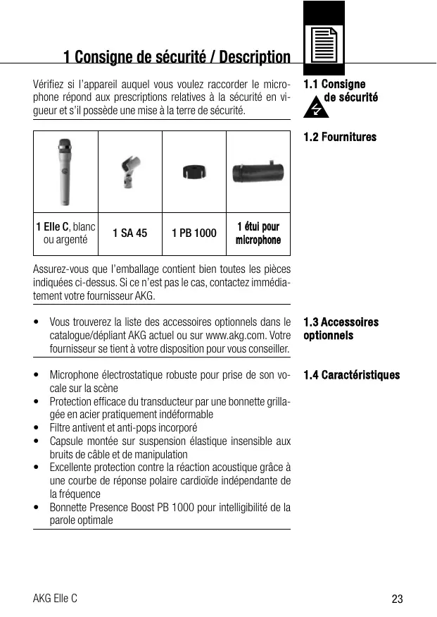 1 Elle C, blanc ou argenté 1 SA 45 1 PB 1000 1 étui pour miccrophone Assurez-vous que l’emballage contient bien toutes les pièces indiquées ci-dessus. Si ce n’est pas le cas, contactez immédiatement votre fournisseur AKG.