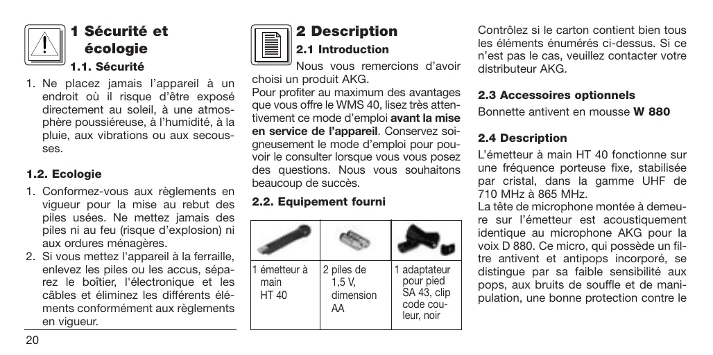 Nous vous remercions d'avoir choisi un produit AKG. Pour profiter au maximum des avantages que vous offre le WMS 40, lisez très atten- tivement ce mode d'emploi avant la mise en service de l'appareil. Conservez soi- gneusement le mode d'emploi pour pou- Voir le consulter lorsque vous vous posez des questions. Nous vous souhaitons 2.2. Equipement fourni beaucoup de succès. dd S pe, H'émetteurà [2 piles de [1 adaptateur main 154 pour pied HT 40 dimension | SA 48, clip AA code cou- leur, noir
