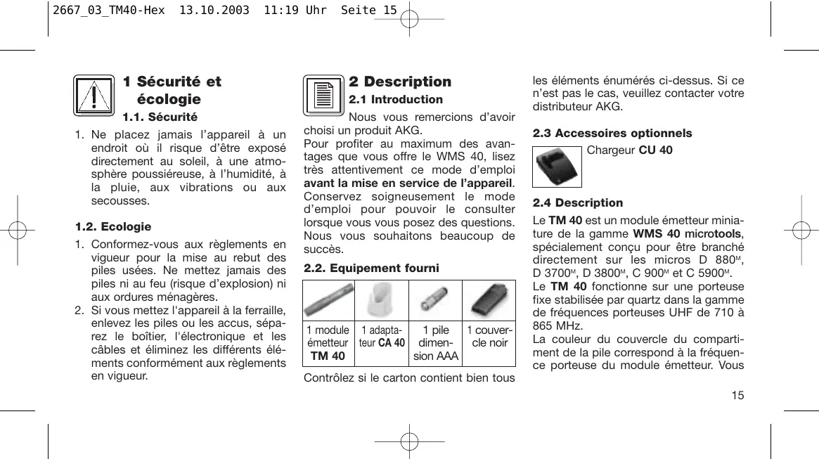 Nous vous remercions d’avoir choisi un produit AKG. Pour profiter au maximum des avantages que vous offre le WMS 40, lisez très attentivement ce mode d’emploi avant la mise en service de l’appareil. Conservez soigneusement le mode d’emploi pour pouvoir le consulter lorsque vous vous posez des questions. Nous vous souhaitons beaucoup de succès. 2.2. Equipement fourni 1 module 1 adapta1 pile 1 couverémetteur teur CA 40 dimencle noir TM 40 sion AAA les éléments énumérés ci-dessus. Si ce n’est pas le cas, veuillez contacter votre distributeur AKG.