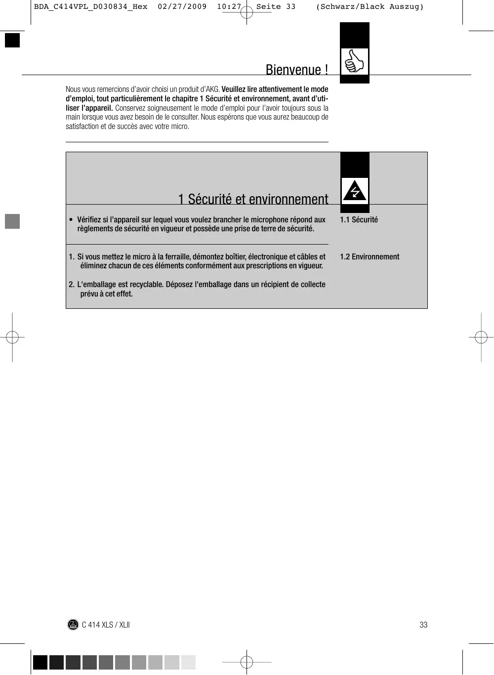 Nous vous remercions d’avoir choisi un produit d’AKG. Veuillez lire attentivement le mode d’emploi, tout particulièrement le chapitre 1 Sécurité et environnement, avant d’utiliser l’appareil. Conservez soigneusement le mode d’emploi pour l’avoir toujours sous la main lorsque vous avez besoin de le consulter. Nous espérons que vous aurez beaucoup de satisfaction et de succès avec votre micro.