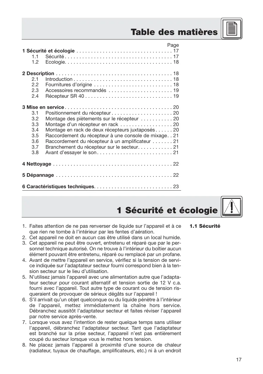 2. Cet appareil ne doit en aucun cas être utilisé dans un local humide. 3. Cet appareil ne peut être ouvert, entretenu et réparé que par le personnel technique autorisé. On ne trouve à l’intérieur du boîtier aucun élément pouvant être entretenu, réparé ou remplacé par un profane. 4. Avant de mettre l’appareil en service, vérifiez si la tension de service indiquée sur l’adaptateur secteur fourni correspond bien à la tension secteur sur le lieu d’utilisation. 5. N’utilisez jamais l’appareil avec une alimentation autre que l’adaptateur secteur pour courant alternatif et tension sortie de 12 V c.a. fourni avec l’appareil. Tout autre type de courant ou de tension risqueraient de provoquer de sérieux dégâts sur l’appareil ! 6. S’il arrivait qu’un objet quelconque ou du liquide pénètre à l’intérieur de l’appareil, mettez immédiatement la chaîne hors service. Débranchez aussitôt l’adaptateur secteur et faites réviser l’appareil par notre service après-vente. 7. Lorsque vous avez l’intention de rester quelque temps sans utiliser l’appareil, débranchez l’adaptateur secteur. Tant que l’adaptateur est branché sur la prise secteur, l’appareil n’est pas entièrement coupé du secteur lorsque vous le mettez hors tension. 8. Ne placez jamais l’appareil à proximité d’une source de chaleur (radiateur, tuyaux de chauffage, amplificateurs, etc.) ni à un endroit