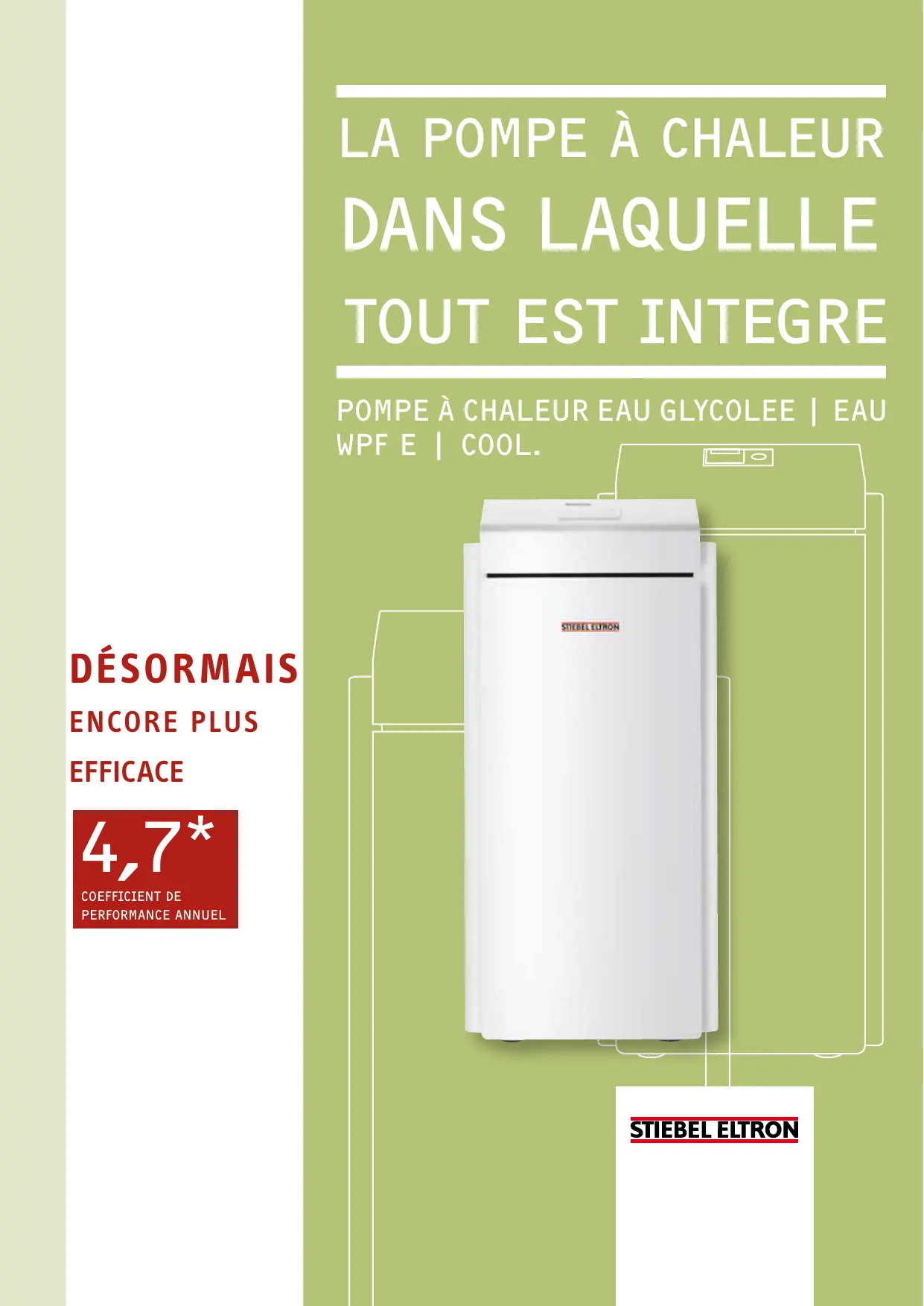 WPF E | COOL. Désormais encore plus efficace 4,7* coefficient de performance annuel Jamais l‘installation n‘aura été aussi rapide Impossible d‘aller plus vite | Gagnez non seulement cinq heures de travail lors du montage d‘une pompe WPF E | cool, mais simplifiez-vous également le montage. Car qu‘il s‘agisse des vases d‘expansion, des pompes à haute efficacité pour le circuit de chauffage et le circuit des sondes, de la tuyauterie y compris l‘isolation ou de l‘installation électrique, la pompe WPF E | cool se montre déjà très complète grâce au pré montage en usine. Et elle offre un confort parfait dès le montage. Profitez de ce degré d‘intégration élevé pour réaliser un montage rapide et réussi. Avantages du montage en usine Installation électrique simple Le local est visiblement plus propre et mieux rangé Gain de phases de travail, de matériel et de temps Sécurité de fonctionnement plus élevée grâce aux composants parfaitement assortis Avantages de la nouvelle WPF E | cool Extrêmement efficace grâce au coefficient de performance annuel de 4,7* Conçue pour le chauffage et la réfrigération (WPF cool) Confort d‘utilisation élevé Modèle Pompes à chaleur eau glycolée | eau WPF E | cool 1) – Type WPF 5 E / WPF 5 cool WPF 7 E / WPF 7 cool
