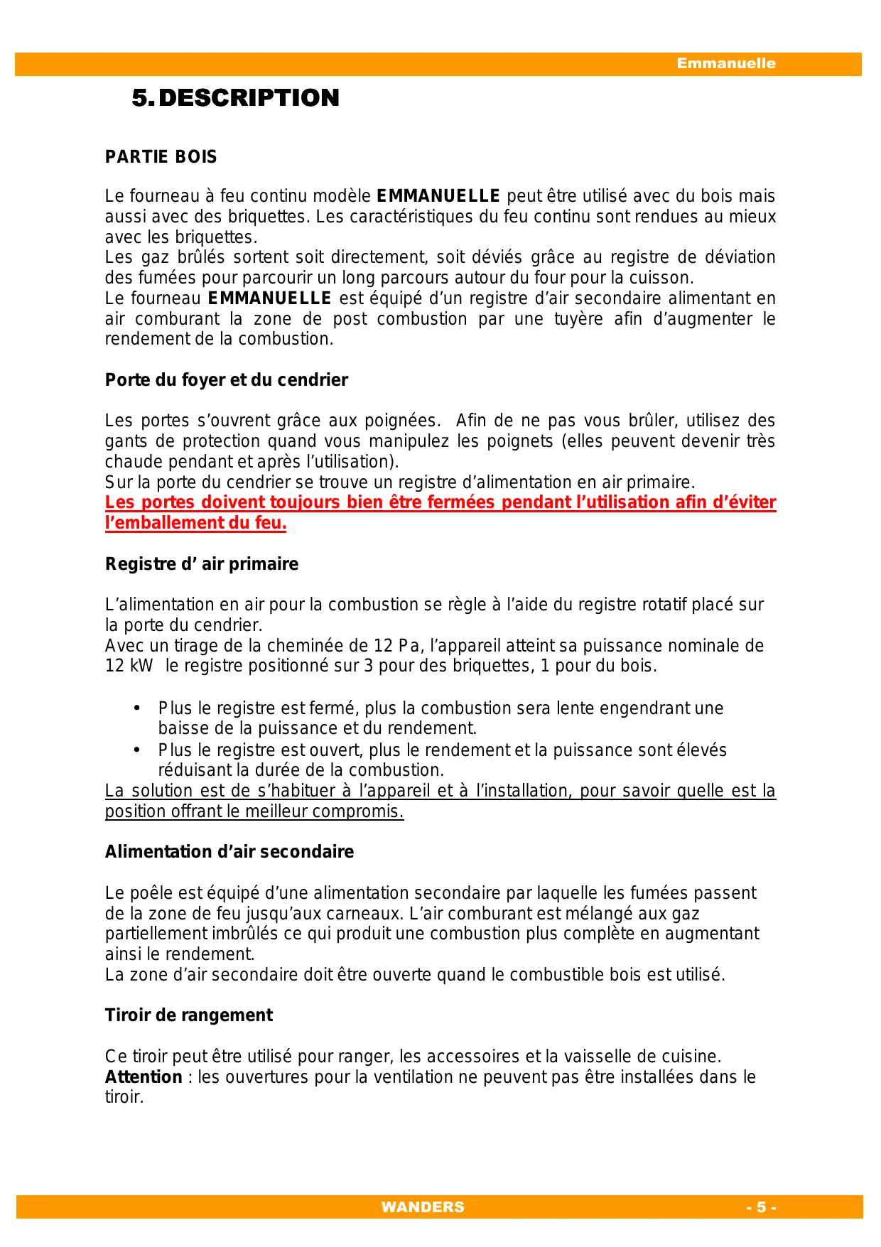EMMANUELLE - Cuisinière à bois WANDERS - Notice d'utilisation et mode d'emploi gratuit