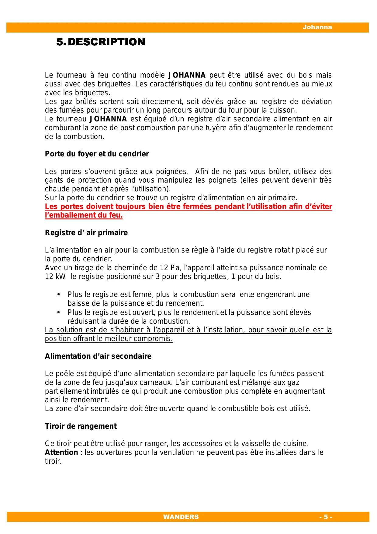 JOHANNA - Cuisinière à bois WANDERS - Notice d'utilisation et mode d'emploi gratuit