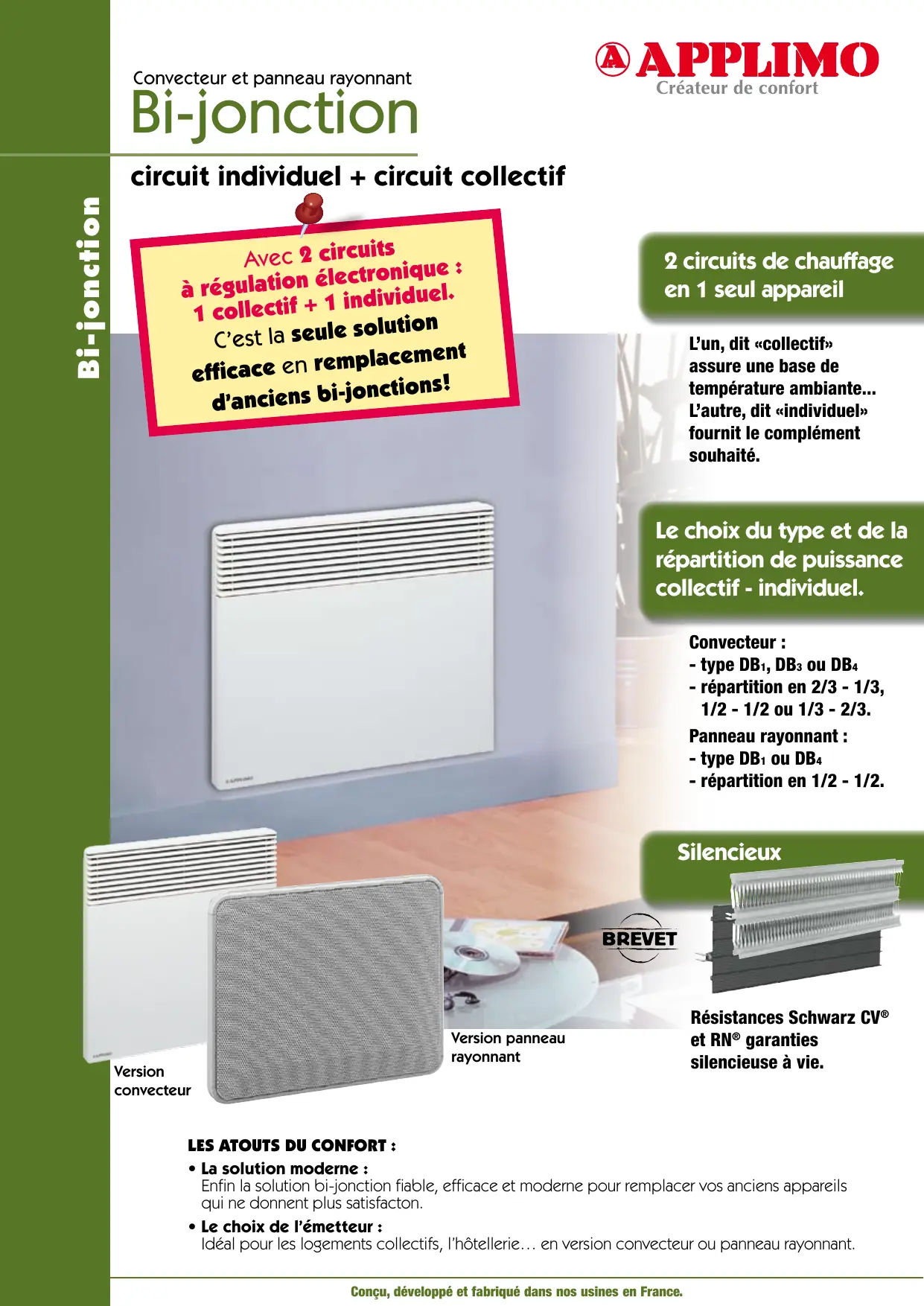 - Le choix de l’émetteur : Idéal pour les logements collectifs, l’hôtellerie… en version convecteur ou panneau rayonnant. Conçu, développé et fabriqué dans nos usines en France. Bi-jonction Bi-jonction DB1 Le circuit collectif est piloté par un poste central de régulation à l’immeuble. Le circuit individuel est piloté par son thermostat. Les 2 circuits fonctionnent indépendamment. FIXATION MURALE