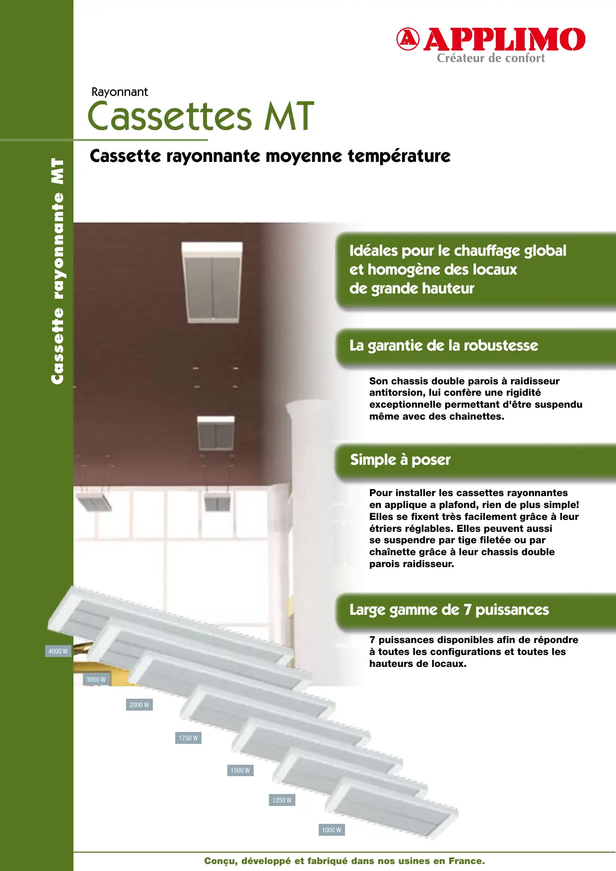 Rayonnant Cassette rayonnante MT Cassettes MT Cassette rayonnante moyenne température Idéales pour le chauffage global et homogène des locaux de grande hauteur La garantie de la robustesse Son chassis double parois à raidisseur antitorsion, lui confère une rigidité exceptionnelle permettant d'être suspendu même avec des chainettes. Simple à poser Pour installer les cassettes rayonnantes en applique a plafond, rien de plus simple! Elles se fixent très facilement grâce à leur étriers réglables. Elles peuvent aussi se suspendre par tige filetée ou par chaînette grâce à leur chassis double parois raidisseur. Large gamme de 7 puissances 7 puissances disponibles afin de répondre à toutes les configurations et toutes les hauteurs de locaux. 4000 W 3000 W 2000 W 1750 W 1500 W 1250 W 1000 W Conçu, développé et fabriqué dans nos usines en France. Cassette MT SIMPLE À POSER EMETTEUR RS Mat® À STRUCTURE MONOBLOC