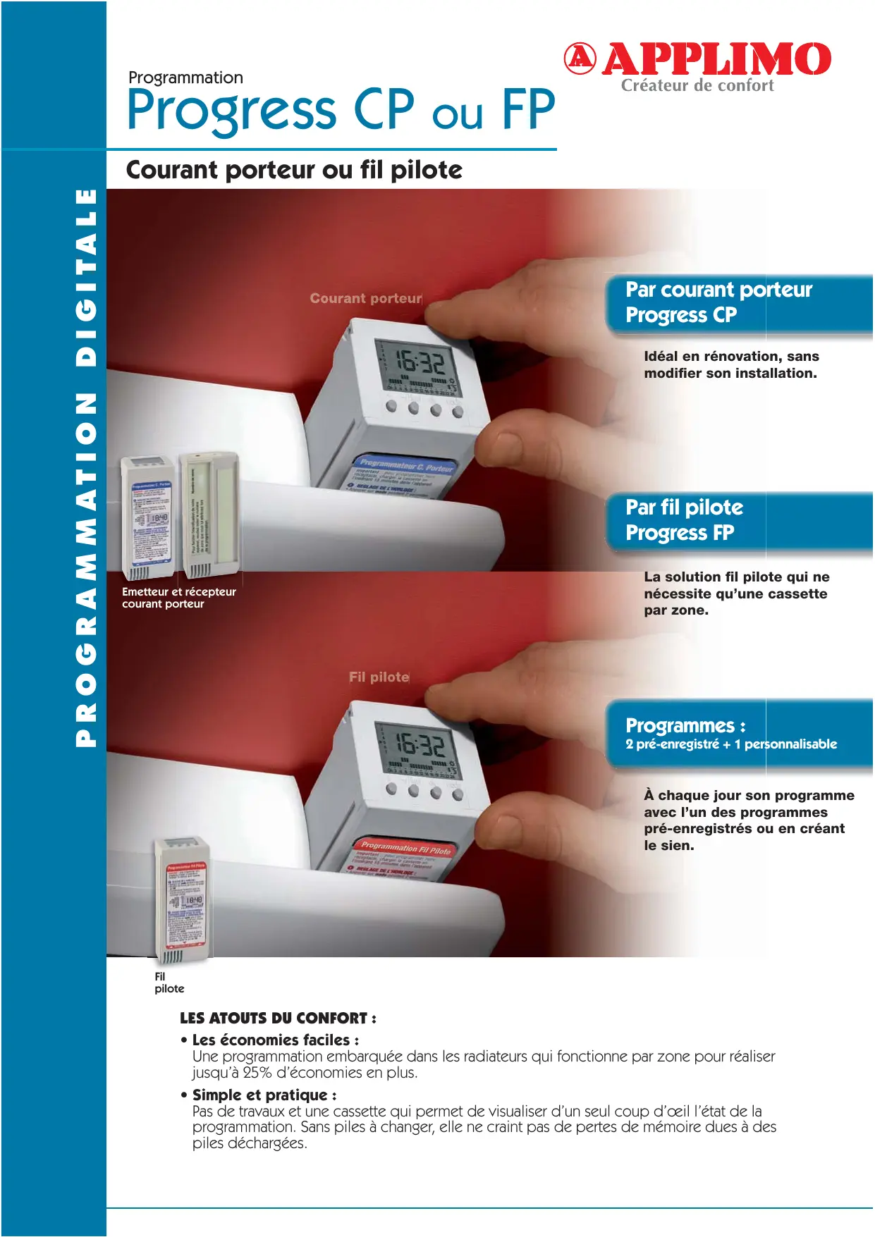 Programmation Progress CP ou FP P R O G R A M M AT I O N D I G I TA L E Courant porteur ou fil pilote Par courant porteur Progress CP Idéal en rénovation, sans modifier son installation. Par fil pilote Progress FP Emetteur et récepteur courant porteur La solution fil pilote qui ne nécessite qu’une cassette par zone. Programmes : 2 pré-enregistré + 1 personnalisable À chaque jour son programme avec l’un des programmes pré-enregistrés ou en créant le sien. Fil pilote LES ATOUTS DU CONFORT :