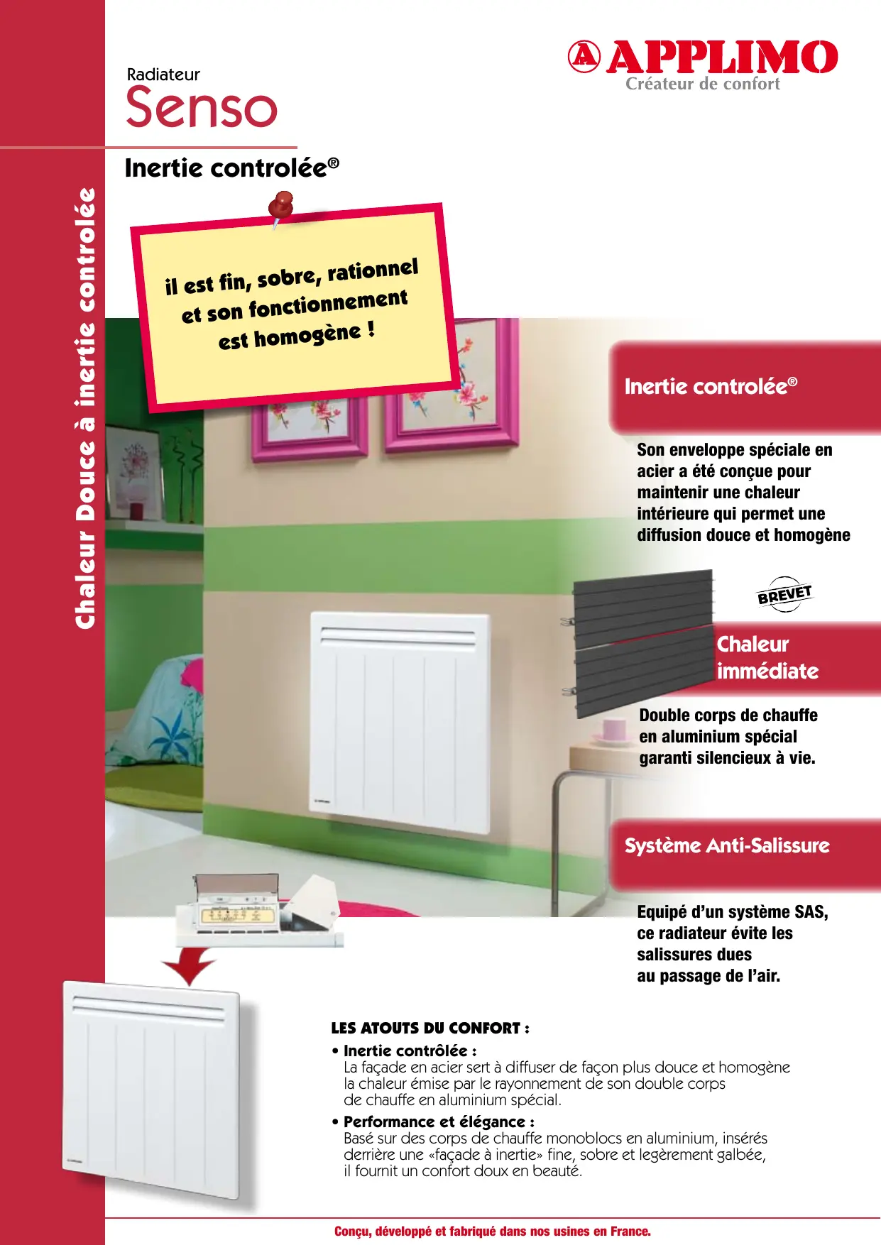 Radiateur Senso Chaleur Douce à inertie controlée Inertie controlée® re, rationnel il est fin, sob nnement et son fonctio est homogèn Inertie controlée® Son enveloppe spéciale en acier a été conçue pour maintenir une chaleur intérieure qui permet une diffusion douce et homogène Chaleur immédiate Double corps de chauffe en aluminium spécial garanti silencieux à vie. Système Anti-Salissure Equipé d’un système SAS, ce radiateur évite les salissures dues au passage de l’air. Les Atouts du confort :