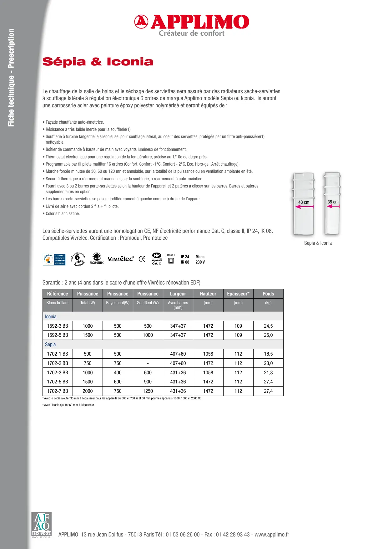 SAPPLIMO Créateur de confort Sépia & Iconia Radiateur sèche-serviettes à soufflerie latérale + Efficacité et performance : Aliant la puissance et le confort, Sépia et Iconia sont des radiateurs sèche-serviettes idéaux pour faire de sa salle de bains un lieu de grand confort. Une soufflrie latérale L'air est soufflé par le côté sur les serviettes et diffusé ensuite dans la salle de bains. Cette soufflerie latérale est équipée d'un fire anti-poussière amovible, nettoyable et réutilisable. + Les barres sont amovibles et coulissantes Les barres porte-serviettes se règlent à la hauteur souhaitée et se positionnent indifféremment à gauche ou à droite de l'appareil. Elles sont «ouvertes» d'un côté, ce qui facilite l'étendage des serviettes. Fiche commerciale - Prescription Caractéristiques + Façade chauffante auto-émettrice. + Résistance à très faible inertie pour la souffleriel. + Soufferie à turbine tangentielle silencieuse, pour soufflage latéral, au coeur des serviettes, protégée par un fire anti-poussière"" nettoyable. Boîtier de commande à hauteur de main avec voyants lumineux de fonctionnement. Thermostat électronique pour une régulation de la température, précise au 1/10** de degré près. + Programmable par il pilote multitarif 6 ordres (Confort, Confort -1°C, Confort - 2°C, Eco, Hors-gel, Arrêt chauffage) + Marche forcée minutée de 30, 60 ou 120 mn et annulable, sur la totalité de la puissance ou en ventilation ambiante‘ en été. + Sécurité thermique à réarmement manuel et, sur la soufferie, à réarmement à auto-maintien. + Carrosserie acier. Peinture époxy polyester polymérisé. 43 cm 5 cm + Fourmi avec 3 ou 2 barres porte-serviettes selon la hauteur de l'appareil et 2 patères à clipser sur les barres. Barres et patères supplémentaires en option. + Les barres porte-serviettes se posent indifféremment à gauche comme à droite de l'appareil + Livré de série avec cordon 2 fils + fil pilote. + Coloris blanc satiné. Sépia & Iconia Référence | Puissance | Puissance | Puissance | Largeur | Hauteur | Epaisseur* | Poids Blanc brillant Total(W) | Rayonnant() | Soufflant(W) | Avec barres (mm) {mm) (kg) (mm) Iconia 1592-3 BB 1000 500 500 347437 1472 109 245 1592-5 BB 1500 500 1000 347437 1472 109 25,0 Sépia 1702-1 BB 500 500 - 407+60 1058 112 165 1702-2 BB 750 750 - 407+60 1472 112 23,0 1702-3 BB 1000 400 600 431+36 1058 112 21,8 1702-5 BB 1500 600 900 431+36 1472 112 274 1702-7 BB 2000 750 1250 431+36 1472 112 274 NEC le Sp ajouter 30 rm à épaisseur pouls apparl de 500 et 70 W 60 men pour les apparl 1000, 1500 1 2000. vec l'ai ajouter 60 rm à l'épaisseus APPLIMO 13 rue Jean Dollfus - 75018 Paris Tél : 01 53 06 26 00 - Fax : 01 42 28 93 43 - www.applimo.fr