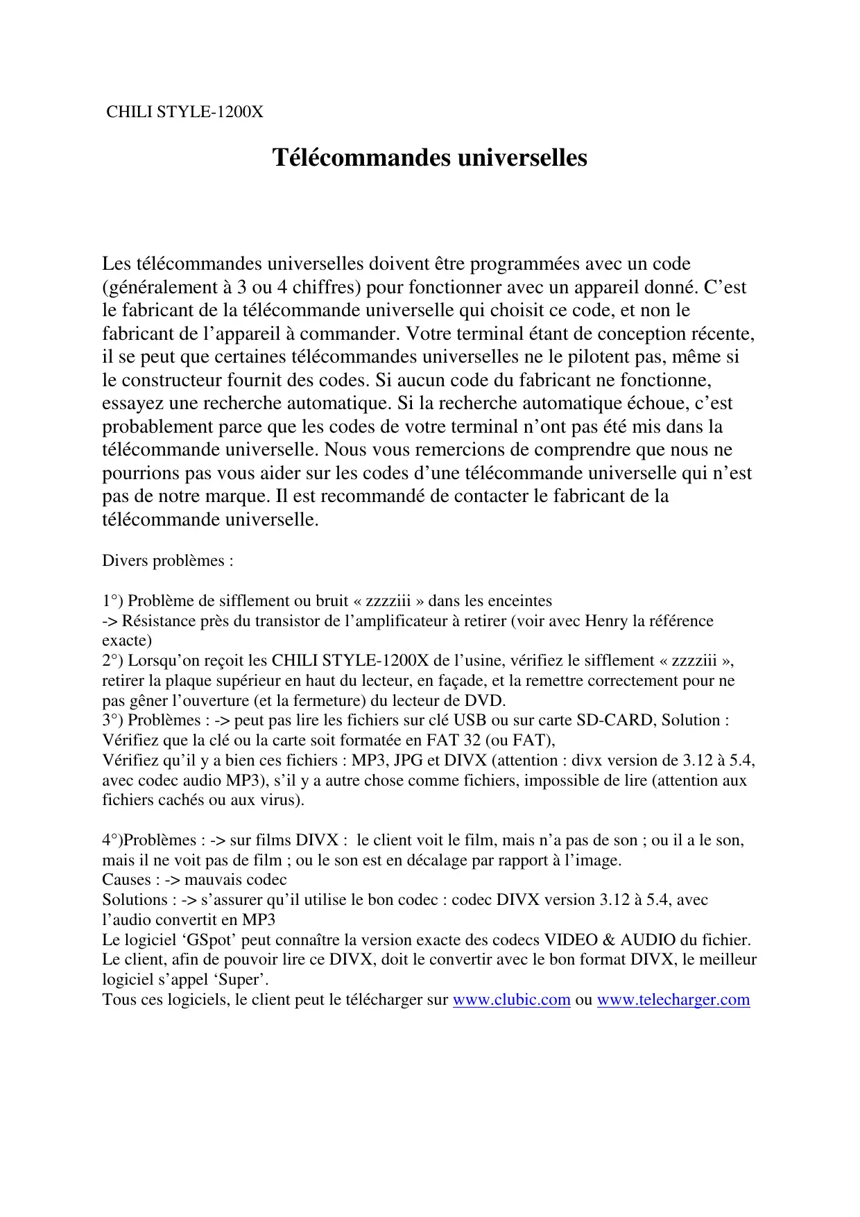 ) Problème de sifflement ou bruit «zzzziii» dans les enceintes -> Résistance près du transistor de l'amplificateur à retarder (voir avec Henry la référence exacte) ) Lorsqu'on reçoit les CHILI STYLE-1200X de l'usine, vérifiez le sifflement «zzzziii», retarder la plaque supérieure en haut du lecteur, en façade, et la remettre correctement pour ne pas générer l'ouverture (et la fermeture) du lecteur de DVD. ) Problèmes: -> peut pas dire les fichiers sur clé USB ou sur carte SD-CARD, Solution : Vérifiez que la clé ou la carte soit formatée en FAT 32 (ou FAT),