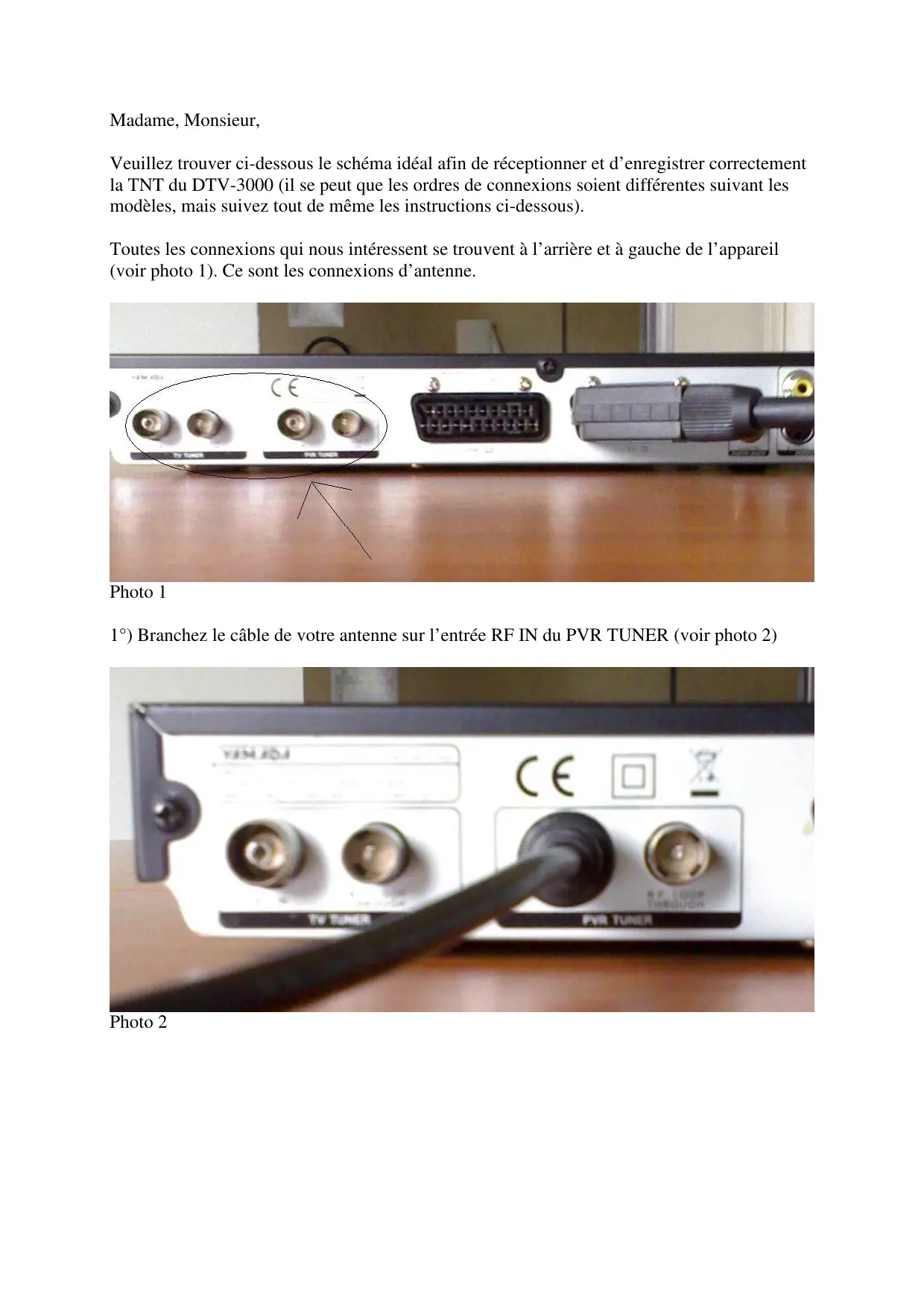 Madame, Monsieur, Veuillez trouver ci-dessous le schéma idéal afin de réceptionner et d’enregistrer correctement la TNT du DTV-3000 (il se peut que les ordres de connexions soient différentes suivant les modèles, mais suivez tout de même les instructions ci-dessous). Toutes les connexions qui nous intéressent se trouvent à l’arrière et à gauche de l’appareil (voir photo 1). Ce sont les connexions d’antenne. Photo 1 1°) Branchez le câble de votre antenne sur l’entrée RF IN du PVR TUNER (voir photo 2) Photo 2 2°) Branchez le petit câble noir (fournis avec les accessoires) de la sortie RF LOOP THROUGH (photo 3) vers l’entrée IN du TV TUNER (voir photo 4) Photo 3 Photo 4 3°) Ensuite, remettez votre appareil en place afin de reconfigurer les chaînes TNT via votre téléviseur. 4°) Appuyez sur la touche MENU de la télécommande (voir photo 5) pour entrer dans le menu de configuration du lecteur (voir photo 6). Photo 5 Photo 6 5°) Déplacer le curseur vers la droite afin d’aller dans la catégorie « Paramètres des chaînes » (voir photo 7) Photo 7 6°) appuyez sur « Paramètres des chaînes », cliquez sur « Rechercher » (voir photo 8), vérifiez que la « recherche » est configuré en « Automatique » (voir photo 9) et que la « mise à jour » est configuré en « Remplacer » (voir photo 10). Ensuite, validez la case « Commencer la Rec… » (voir photo 11) pour lancer le balayages des chaînes TNT (voir photo 12). Normalement, le décodeur TNT trouvera et classera automatiquement les chaînes TNT. Si cela ne fonctionne toujours pas, veuillez changer le petit câble noir de liaison par un câble classique et refaire toutes les manipulations à partir de l’étape 3. Photo 8 Photo 9 Photo 10 Photo 11 Photo 12 Auteur : Nicolas MEYER Date : 24 août 2007