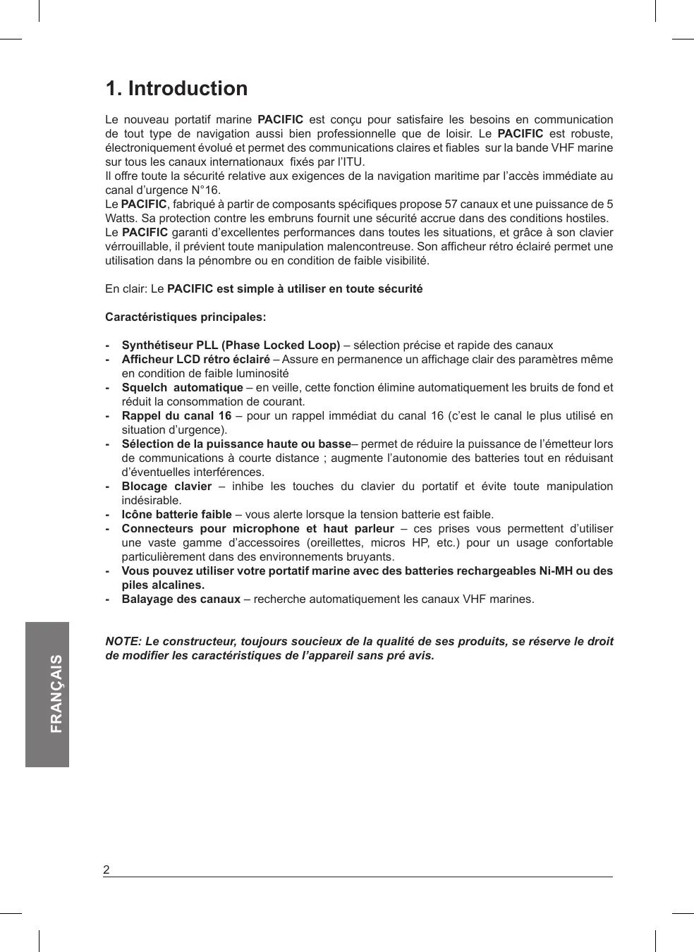 Synthétiseur PLL (Phase Locked Loop) – sélection précise et rapide des canaux Afficheur LCD rétro éclairé – Assure en permanence un affichage clair des paramètres même en condition de faible luminosité Squelch automatique – en veille, cette fonction élimine automatiquement les bruits de fond et réduit la consommation de courant. Rappel du canal 16 – pour un rappel immédiat du canal 16 (c’est le canal le plus utilisé en situation d’urgence). Sélection de la puissance haute ou basse– permet de réduire la puissance de l’émetteur lors de communications à courte distance ; augmente l’autonomie des batteries tout en réduisant d’éventuelles interférences. Blocage clavier – inhibe les touches du clavier du portatif et évite toute manipulation indésirable. Icône batterie faible – vous alerte lorsque la tension batterie est faible. Connecteurs pour microphone et haut parleur – ces prises vous permettent d’utiliser une vaste gamme d’accessoires (oreillettes, micros HP, etc.) pour un usage confortable particulièrement dans des environnements bruyants. Vous pouvez utiliser votre portatif marine avec des batteries rechargeables Ni-MH ou des piles alcalines. Balayage des canaux – recherche automatiquement les canaux VHF marines. NOTE: Le constructeur, toujours soucieux de la qualité de ses produits, se réserve le droit de modifier les caractéristiques de l’appareil sans pré avis.