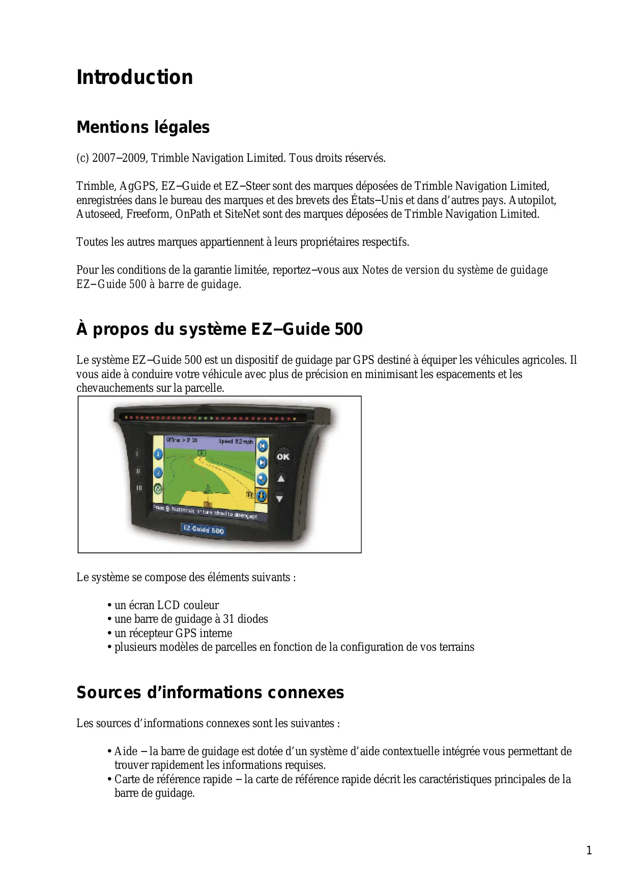 - Charger une prescription iii Introduction Mentions légales (c) 2007−2009, Trimble Navigation Limited. Tous droits réservés. Trimble, AgGPS, EZ−Guide et EZ−Steer sont des marques déposées de Trimble Navigation Limited, enregistrées dans le bureau des marques et des brevets des États−Unis et dans d’autres pays. Autopilot, Autoseed, Freeform, OnPath et SiteNet sont des marques déposées de Trimble Navigation Limited. Toutes les autres marques appartiennent à leurs propriétaires respectifs. Pour les conditions de la garantie limitée, reportez−vous aux Notes de version du système de guidage EZ−Guide 500 à barre de guidage. À propos du système EZ−Guide 500 Le système EZ−Guide 500 est un dispositif de guidage par GPS destiné à équiper les véhicules agricoles. Il vous aide à conduire votre véhicule avec plus de précision en minimisant les espacements et les chevauchements sur la parcelle. Le système se compose des éléments suivants : p. 96