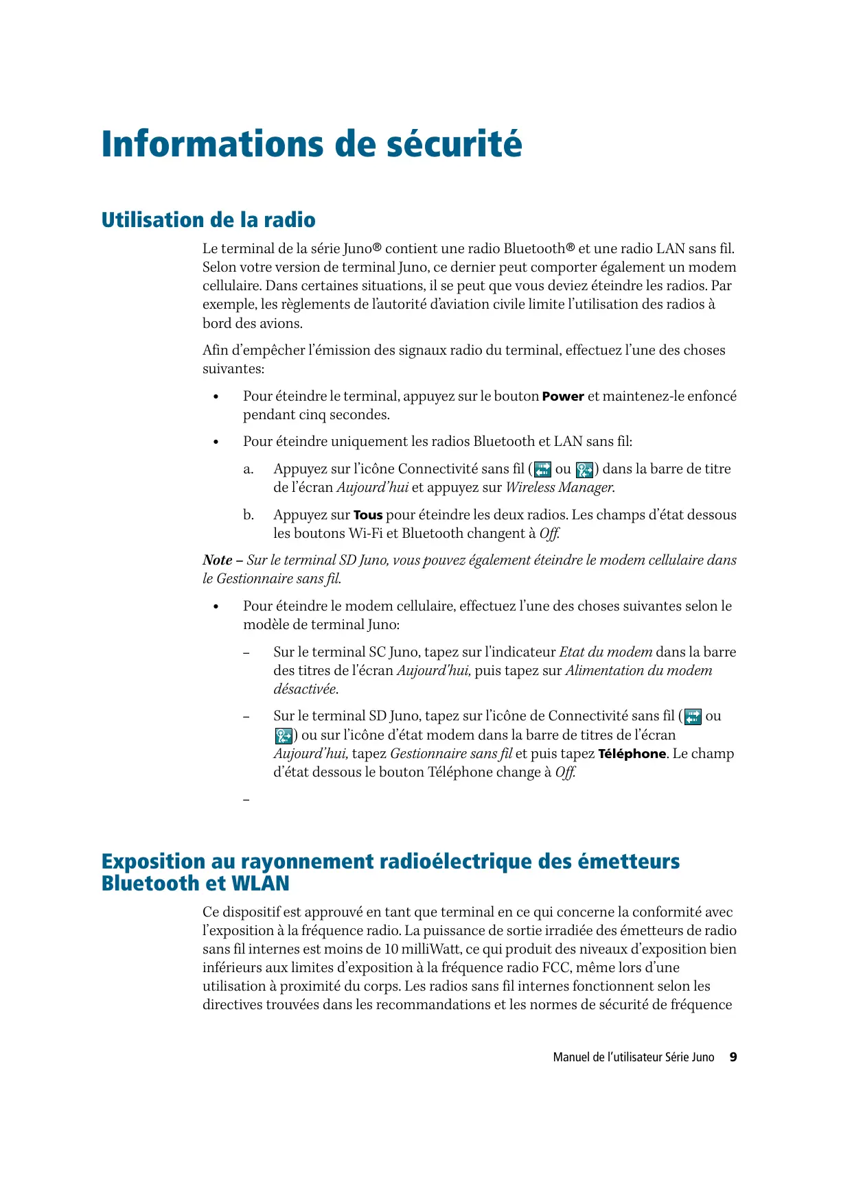 Manuel de l’utilisateur Série Juno Informations de sécurité Utilisation de la radio Le terminal de la série Juno® contient une radio Bluetooth® et une radio LAN sans fil. Selon votre version de terminal Juno, ce dernier peut comporter également un modem cellulaire. Dans certaines situations, il se peut que vous deviez éteindre les radios. Par exemple, les règlements de l’autorité d’aviation civile limite l’utilisation des radios à bord des avions. Afin d’empêcher l’émission des signaux radio du terminal, effectuez l’une des choses suivantes: