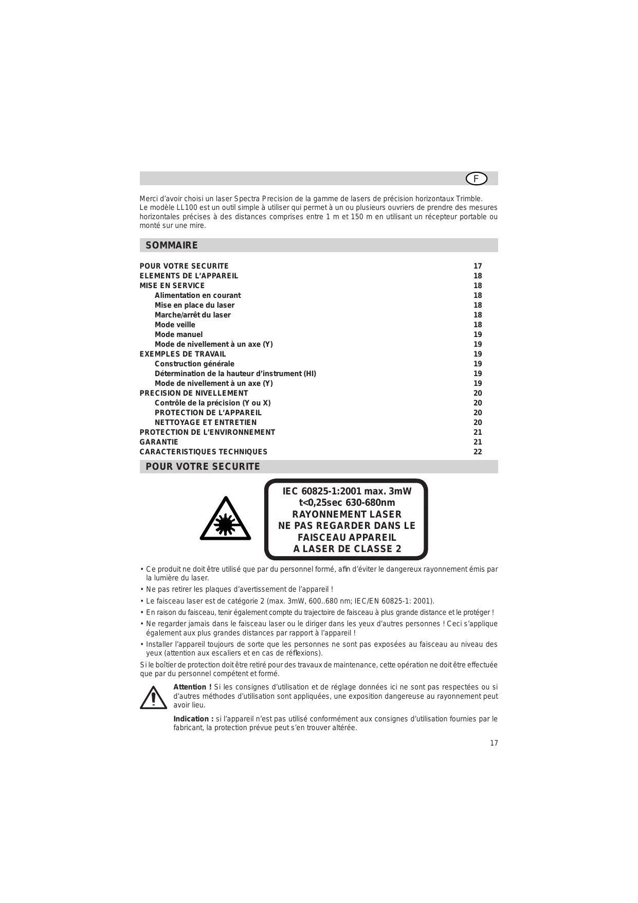 Merci d’avoir choisi un laser Spectra Precision de la gamme de lasers de précision horizontaux Trimble. Le modèle LL100 est un outil simple à utiliser qui permet à un ou plusieurs ouvriers de prendre des mesures horizontales précises à des distances comprises entre 1 m et 150 m en utilisant un récepteur portable ou monté sur une mire. SOMMAIRE