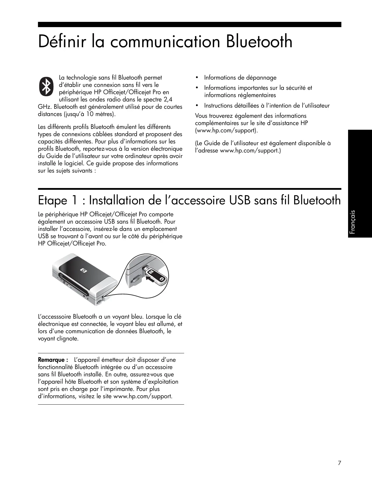 - Instructions détaillées à l’intention de l’utilisateur Vous trouverez également des informations complémentaires sur le site d’assistance HP (www.hp.com/support). (Le Guide de l’utilisateur est également disponible à l’adresse www.hp.com/support.) Etape 1 : Installation de l’accessoire USB sans fil Bluetooth Français Le périphérique HP Officejet/Officejet Pro comporte également un accessoire USB sans fil Bluetooth. Pour installer l’accessoire, insérez-le dans un emplacement USB se trouvant à l’avant ou sur le côté du périphérique HP Officejet/Officejet Pro. L’accesssoire Bluetooth a un voyant bleu. Lorsque la clé électronique est connectée, le voyant bleu est allumé, et lors d’une communication de données Bluetooth, le voyant clignote. Remarque : L’appareil émetteur doit disposer d’une fonctionnalité Bluetooth intégrée ou d’un accessoire sans fil Bluetooth installé. En outre, assurez-vous que l’appareil hôte Bluetooth et son système d’exploitation sont pris en charge par l’imprimante. Pour plus d’informations, visitez le site www.hp.com/support.