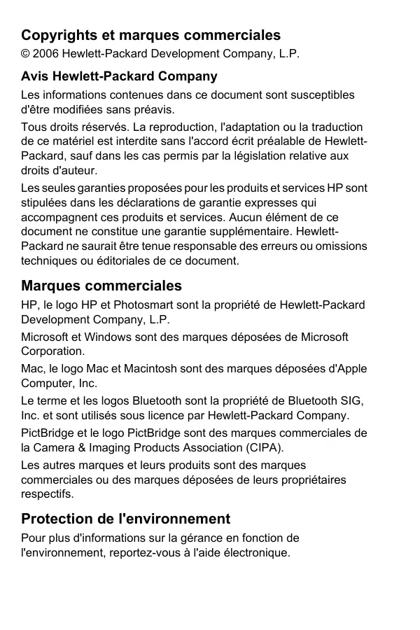 HP Photosmart série A310 Guide de l'utilisateur Liste des numéros de téléphone d'assistance La suite de cette liste des numéros de téléphone d'assistance se poursuit sur la couverture interne arrière de ce guide. Imprimante HP Photosmart série A310 HP Photosmart série A310 Copyrights et marques commerciales © 2006 Hewlett-Packard Development Company, L.P. Avis Hewlett-Packard Company Les informations contenues dans ce document sont susceptibles d'être modifiées sans préavis. Tous droits réservés. La reproduction, l'adaptation ou la traduction de ce matériel est interdite sans l'accord écrit préalable de HewlettPackard, sauf dans les cas permis par la législation relative aux droits d'auteur. Les seules garanties proposées pour les produits et services HP sont stipulées dans les déclarations de garantie expresses qui accompagnent ces produits et services. Aucun élément de ce document ne constitue une garantie supplémentaire. HewlettPackard ne saurait être tenue responsable des erreurs ou omissions techniques ou éditoriales de ce document. Marques commerciales HP, le logo HP et Photosmart sont la propriété de Hewlett-Packard Development Company, L.P. Microsoft et Windows sont des marques déposées de Microsoft Corporation. Mac, le logo Mac et Macintosh sont des marques déposées d'Apple Computer, Inc. Le terme et les logos Bluetooth sont la propriété de Bluetooth SIG, Inc. et sont utilisés sous licence par Hewlett-Packard Company. PictBridge et le logo PictBridge sont des marques commerciales de la Camera & Imaging Products Association (CIPA). Les autres marques et leurs produits sont des marques commerciales ou des marques déposées de leurs propriétaires respectifs. Protection de l'environnement Pour plus d'informations sur la gérance en fonction de l'environnement, reportez-vous à l'aide électronique. Numéro réglementaire d'identification de modèle VCVRA-0604 Pour des motifs réglementaires d'identification, un numéro réglementaire de modèle a été affecté à votre produit. Le numéro réglementaire d'identification de modèle de votre produit est le VCVRA-0604. Ne confondez pas le numéro réglementaire et le nom marketing (HP Photosmart série A310) ou le numéro de produit (Q8471A). Sommaire