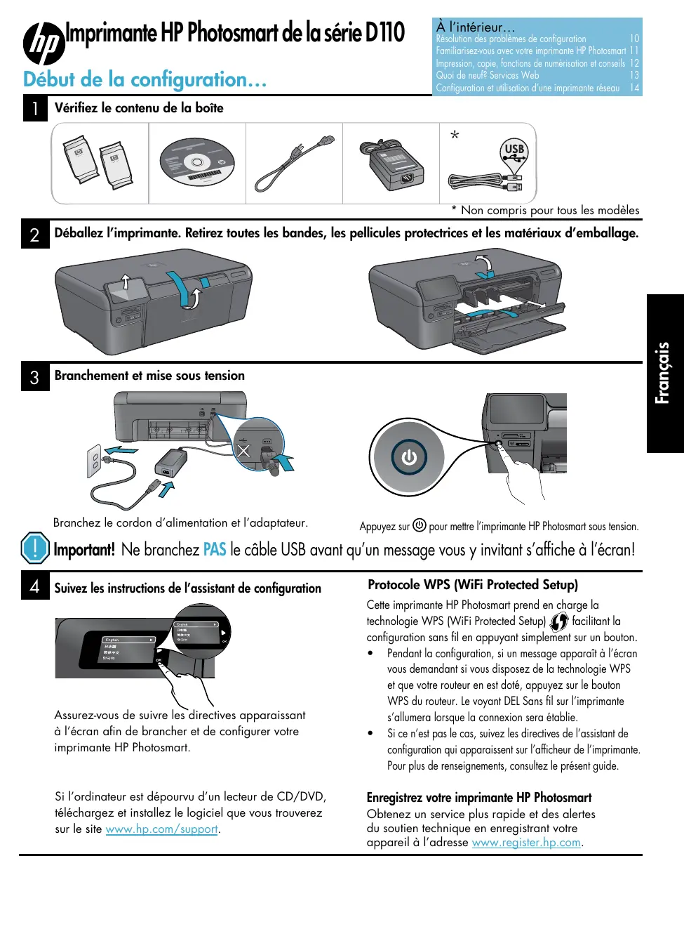Familiarisezvous avec voire imprimante HP Photosmart 11 Impression, copie, onclons de numérsaon e conseils 12 : : Quoi de neuf Services Web E Début de la configuration. Éd E Vérifiez le contenu de la boîte ee + E Déballez l'imprimante. Retirez toutes les bandes, les pellicules protectrices et les matériaux d'emballage. E Branchement et mise sous tension ! Branchez le cordon d'alimentation et l'adaptateur. Appuyez sur ©) pour metre l'imprimante HP Photosmart sous tension. © Important! Ne branchez PAS le câble USB avant qu'un message vous y invitant s'affiche à l'écran! (Ap Asus HP Photosmart de la série DO liner Rd ren 10