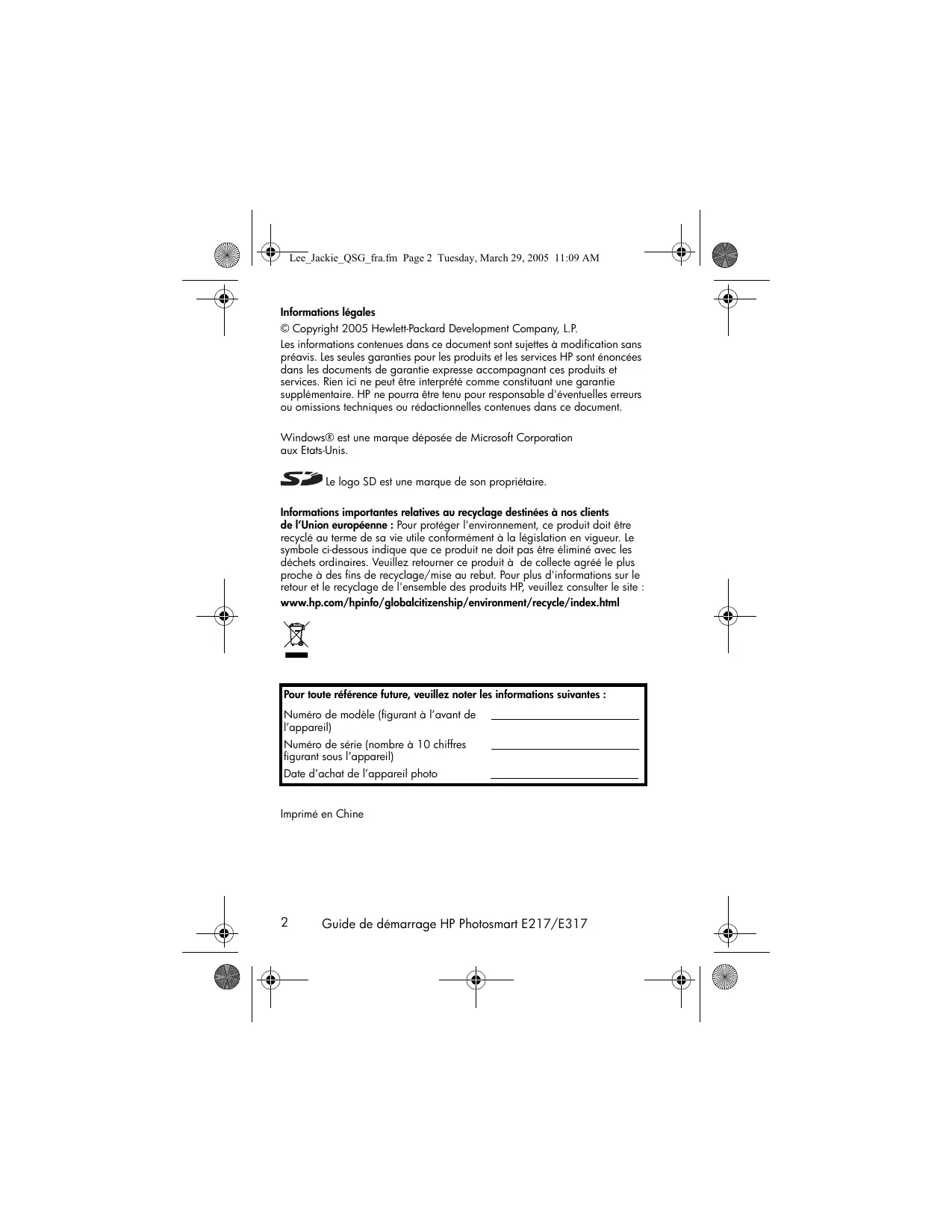© Copyright 2005 Hewlett-Packard Development Company, L.P. Les informations contenues dans ce document sont sujettes à modification sans préavis. Les seules garanties pour les produits et les services HP sont énoncées dans les documents de garantie expresse accompagnant ces produits et services. Rien ici ne peut être interprété comme constituant une garantie supplémentaire. HP ne pourra être tenu pour responsable d'éventuelles erreurs ou omissions techniques ou rédactionnelles contenues dans ce document. Windows® est une marque déposée de Microsoft Corporation aux Etats-Unis. Le logo SD est une marque de son propriétaire. Informations importantes relatives au recyclage destinées à nos clients de l’Union européenne : Pour protéger l'environnement, ce produit doit être recyclé au terme de sa vie utile conformément à la législation en vigueur. Le symbole ci-dessous indique que ce produit ne doit pas être éliminé avec les déchets ordinaires. Veuillez retourner ce produit à de collecte agréé le plus proche à des fins de recyclage/mise au rebut. Pour plus d'informations sur le retour et le recyclage de l'ensemble des produits HP, veuillez consulter le site : www.hp.com/hpinfo/globalcitizenship/environment/recycle/index.html