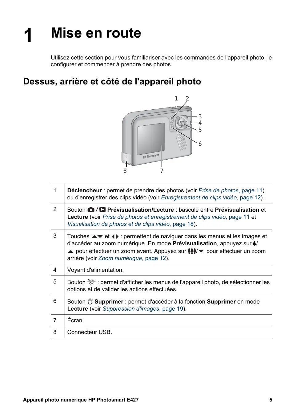 Mise en route5 Dessus, arrière et côté de l'appareil photo5 Avant, dessous et côté de l'appareil photo6 Avant de prendre des photos6 Installation des piles7 Allumage de l'appareil photo7 Sélection de la langue7 Réglage de la date et de l'heure7 Insertion et formatage d'une carte mémoire en option8 Installation du logiciel9 Utilisation de votre appareil photo10 Prise de photos et enregistrement de clips vidéo11 Prise de photos11 Enregistrement de clips vidéo12 Revisualisation instantanée12 Zoom numérique12 Utilisation des paramètres de plage de mise au point13 Utilisation du Menu Capture13 Utilisation du mode Retardateur16 Paramètres flash—Anti-yeux rouges16 Option Compens. exposition16 Option Balance des blancs16 Sensibilité ISO16 Visualisation de photos et de clips vidéo18 Utilisation du mode Lecture18 Suppression d'images19 Utilisation du Menu Lecture19 Affichage des miniatures20 Agrandissement des images20 Sélection d'images à imprimer20 Enregistrement de commentaires audio20 Transfert et impression d'images22 Transfert d'images avec le logiciel HP Photosmart22 Transfert d'images sans le logiciel HP Photosmart22 Connexion à l'ordinateur23 Utilisation d'un lecteur de carte mémoire23 Impression d'images à partir de l'appareil photo24 Utilisation du Menu Configuration25 Dépannage26 Réinitialisation de l'appareil photo26 Problèmes et solutions26 Support produit30 Sites Web utiles30 Accès au support30