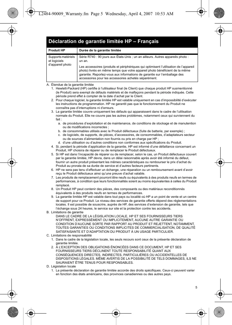 1. Hewlett-Packard (HP) certifie à l’utilisateur final (le Client) que chaque produit HP susmentionné (le Produit) sera exempt de défauts matériels et de malfaçons pendant la période indiquée. Cette période prend effet à compter de la date d’achat par le Client. 2. Pour chaque logiciel, la garantie limitée HP est valable uniquement en cas d’impossibilité d’exécuter les instructions de programmation. HP ne garantit pas que le fonctionnement du Produit ne connaîtra pas d’interruptions ni d’erreurs. 3. La garantie limitée couvre uniquement les défauts qui apparaissent dans le cadre de l’utilisation normale du Produit. Elle ne couvre pas les autres problèmes, notamment ceux qui surviennent du fait : a. de procédures d’exploitation et de maintenance, de conditions de stockage et de manutention ou de modifications incorrectes ; b. de consommables utilisés avec le Produit défectueux (fuite de batterie, par exemple) ; c. de logiciels, de supports, de pièces, d’accessoires, de consommables, d’adaptateurs secteur ou de sources d’alimentation non fournis ou pris en charge par HP ; d. d’une utilisation ou d’autres conditions non conformes aux spécifications du Produit. 4. Si, pendant la période d’application de la garantie, HP est informé d’une défaillance concernant un Produit, HP choisira de réparer ou de remplacer le Produit défectueux. 5. Si HP est dans l’incapacité de réparer ou de remplacer, selon le cas, un Produit défectueux couvert par la garantie limitée, HP devra, dans un délai raisonnable après avoir été informé du défaut, fournir un autre produit présentant les mêmes caractéristiques ou rembourser le prix d’achat du Produit au prorata de sa durée de service et d’autres facteurs pertinents. 6. HP ne sera pas tenu d’effectuer un échange, une réparation ou un remboursement avant d’avoir reçu le Produit défectueux ainsi qu’une preuve d’achat valable. 7. Les produits de remplacement pourront être neufs ou équivalents à des produits neufs en termes de performances, à condition que leurs fonctionnalités soient au moins équivalentes à celles du Produit remplacé. 8. Un Produit HP peut contenir des pièces, des composants ou des matériaux reconditionnés équivalents à des produits neufs en termes de performances. 9. La garantie limitée HP est valable dans tout pays ou localité où HP a un point de vente et un centre de support pour ce Produit. Le niveau des services de garantie offerts dépend des réglementations locales. Il est possible de souscrire, auprès de HP, des services d’extension de garantie, tels que l’échange sous 24 heures, le service sur site et la protection contre les accidents. B. Limitations de garantie DANS LE CADRE DE LA LÉGISLATION LOCALE, HP ET SES FOURNISSEURS TIERS N’OFFRENT, EXPRESSÉMENT OU IMPLICITEMENT, AUCUNE AUTRE GARANTIE OU CONDITION D’AUCUNE SORTE PAR RAPPORT AU PRODUIT ET REJETTENT, NOTAMMENT, TOUTES GARANTIES OU CONDITIONS IMPLICITES DE COMMERCIALISATION, DE QUALITÉ SATISFAISANTE ET D’ADAPTATION DU PRODUIT À UN USAGE PARTICULIER. C. Limitations de responsabilité 1. Dans le cadre de la législation locale, les seuls recours sont ceux de la présente déclaration de garantie limitée. 2. À L’EXCEPTION DES OBLIGATIONS ÉNONCÉES DANS CE DOCUMENT, HP ET SES FOURNISSEURS TIERS DÉCLINENT TOUTE RESPONSABILITÉ QUANT AUX CONSÉQUENCES DIRECTES, INDIRECTES, PARTICULIÈRES OU ACCIDENTELLES DE DISPOSITIONS LÉGALES. MÊME AVERTIS DE LA POSSIBILITÉ DE TELS DOMMAGES, ILS NE SAURAIENT ÊTRE TENUS POUR RESPONSABLES. D. Législation locale 1. La présente déclaration de garantie limitée accorde des droits spécifiques. Ceux-ci peuvent varier en fonction des états américains, des provinces canadiennes ou des autres pays.