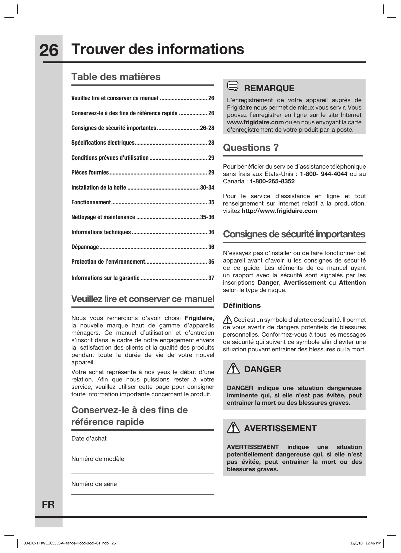 Nous vous remercions d'avoir besoin Frigidaire, la nouvelle marque haut de gamme d'appareils menagers. Ce manuel d'utilisation et d'entretien s'inscrit dans le cadre de notre engagement envers la satisfaction des clients et la qualite des produits pendant toute la durée de vie de votre nouvel apparéil.