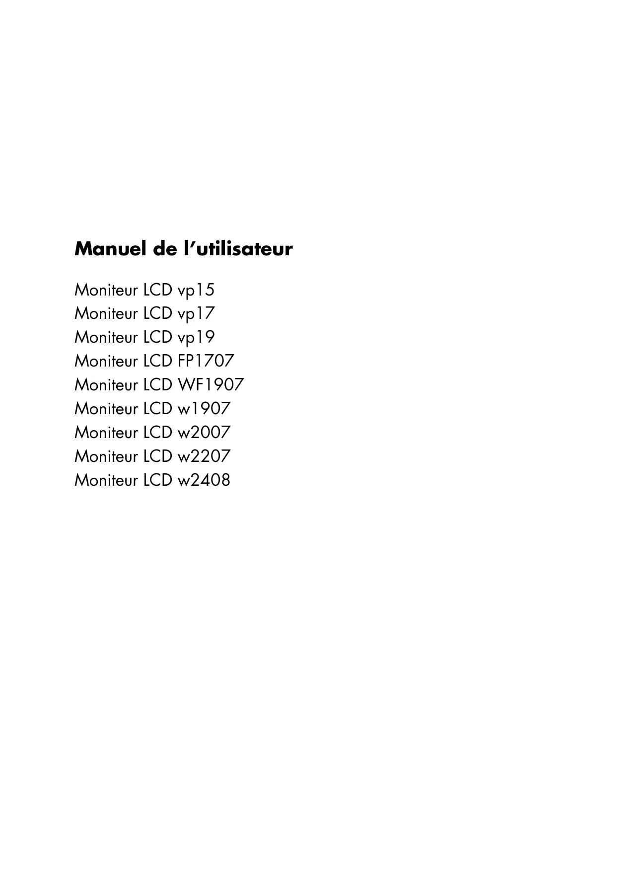 Caractéristiques du produit Moniteurs LCD HP Les moniteurs LCD (écran à cristaux liquides) HP possèdent une matrice active à transistor en couches minces (TFT). Ce guide décrit les modèles suivants :