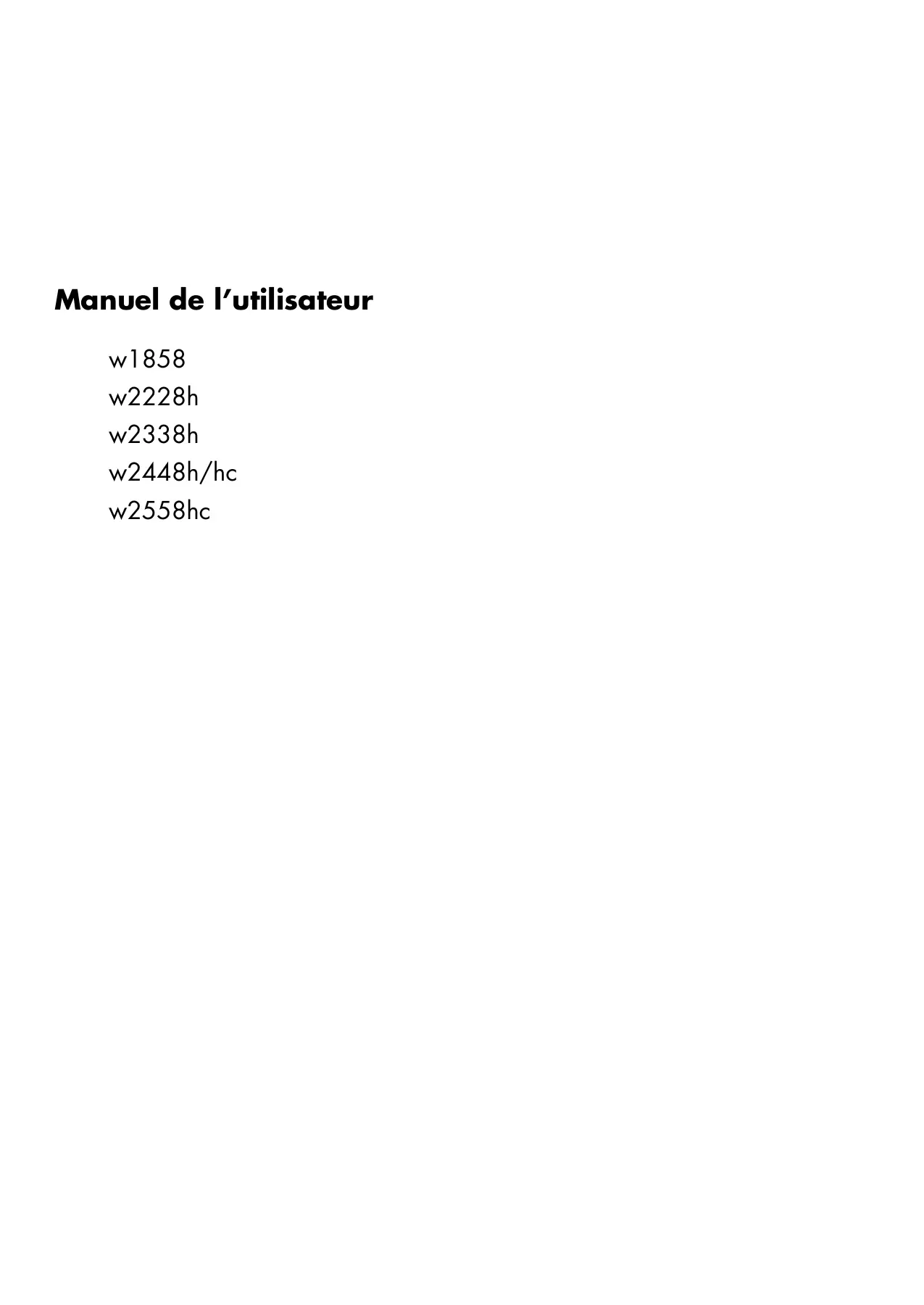 Manuel de l’utilisateur w1858 w2228h w2338h w2448h/hc w2558hc Les garanties des produits et services HP sont exclusivement présentées dans les déclarations expresses de garantie accompagnant ces produits et services. Aucun élément du présent document ne saurait être considéré comme une garantie supplémentaire. La société HP ne saurait être tenue responsable des erreurs ou omissions de nature technique ou rédactionnelle qui pourraient subsister dans le présent document. La société HP n’assume aucune responsabilité quant à l’utilisation ou à la fiabilité de ses logiciels sur un matériel qui n’est pas fourni par HP. Le présent document contient des informations exclusives protégées par copyright. Aucune partie du présent document ne saurait être photocopiée, reproduite ou traduite dans une autre langue sans l’autorisation écrite préalable de HP. Hewlett-Packard Company 10955 Tantau Avenue Cupertino, California 95014-0770 États-Unis Copyright © 2006–2008 Hewlett-Packard Development Company, L.P. Microsoft et Windows sont des marques déposées aux États-Unis de Microsoft Corporation. Adobe et Acrobat sont des marques de commerce de Adobe Systems Incorporated. ENERGY STAR et le logo ENERGY STAR sont des marques déposées de l’Agence américaine de protection de l’environnement (EPA). Bluetooth est une marque de commerce de son propriétaire, utilisée sous licence par Hewlett-Packard Company. HP est en faveur d’une utilisation licite des technologies et n’appuie ni n’encourage l’utilisation de ses produits à d’autres fins que celles autorisées par la loi sur les droits d’auteur. Les informations contenues dans le présent document peuvent faire l’objet de modifications sans préavis. Conventions typographiques La section suivante décrit les conventions typographiques utilisées dans le présent document. Remarques, Précautions et Avertissements Dans ce guide, les blocs de texte peuvent être accompagnés d’une icône. Ces blocs présentent des remarques, précautions et avertissements, et ils sont utilisés de la manière suivante :