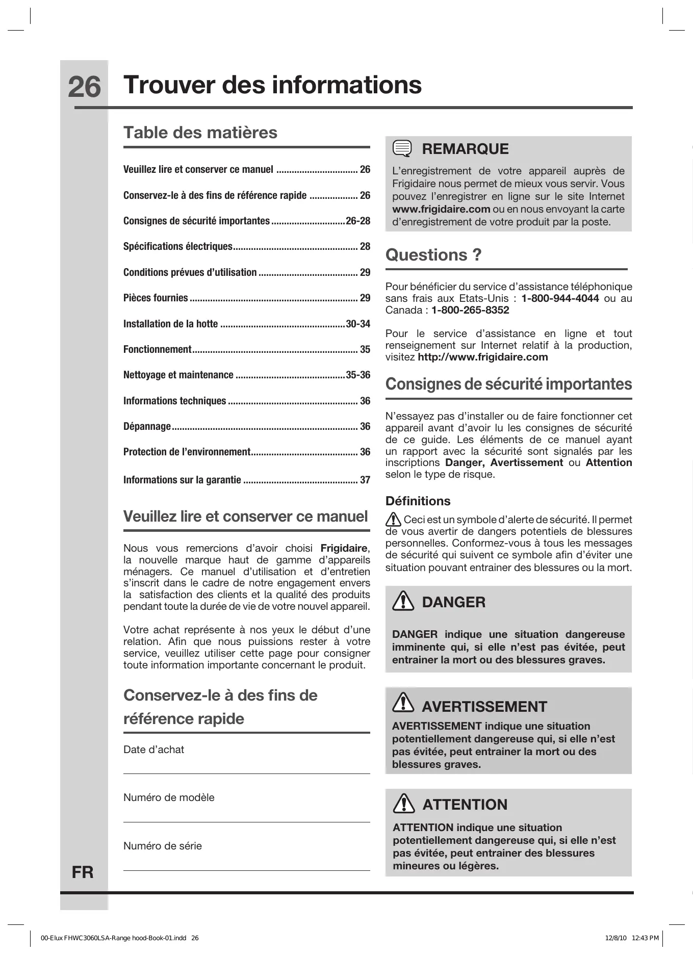 Nous vous remercions d'avoir besoin Frigidaire, la nouvelle marque haut de gamme d'appareils menagers. Ce manuel d'utilisation et d'entretien s'inscrit dans le cadre de notre engagement envers la satisfaction des clients et la qualite des produits pendant toute la durée de vie de votre nouvel applarel.
