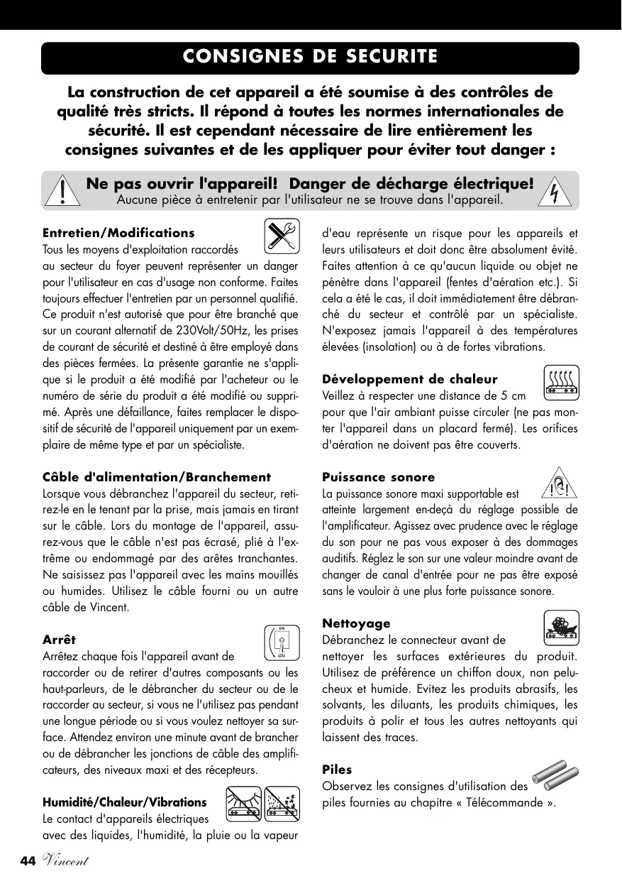 incidence sur le son. Posez l'appareil uniquement sur une surface appropriée et stable. Pour profiter pleinement du potentiel sonore de votre système, nous vous recommendons de placer les apparheils sur des racks Vincent et de ne pas les poser l'un sur l'autre.