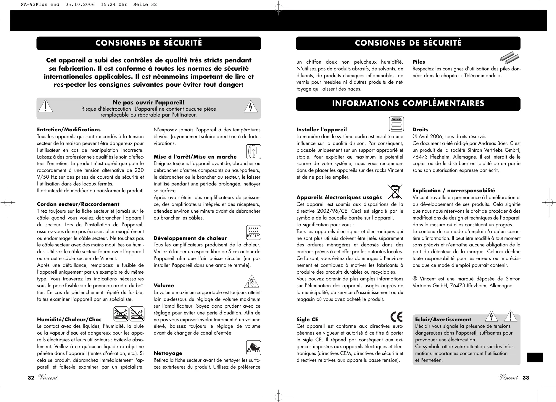 Vincent travaille en permanence à l'amélioration et au développement de ses produits. Cela signifie que nous nous réservons le droit de procéder à des modifications de design et techniques de l'appareil dans la mesure où elles constituent un progrès. Le contenu de ce mode d'emploi n'a qu'un caractère d'information. Il peut être modifié à tout moment sans préavis et n'entraîne aucune obligation de la part du détenteur de la marque. Celui-ci décline toute responsabilité pour les erreurs ou imprécisions que ce mode d'emploi pourrait contenir.